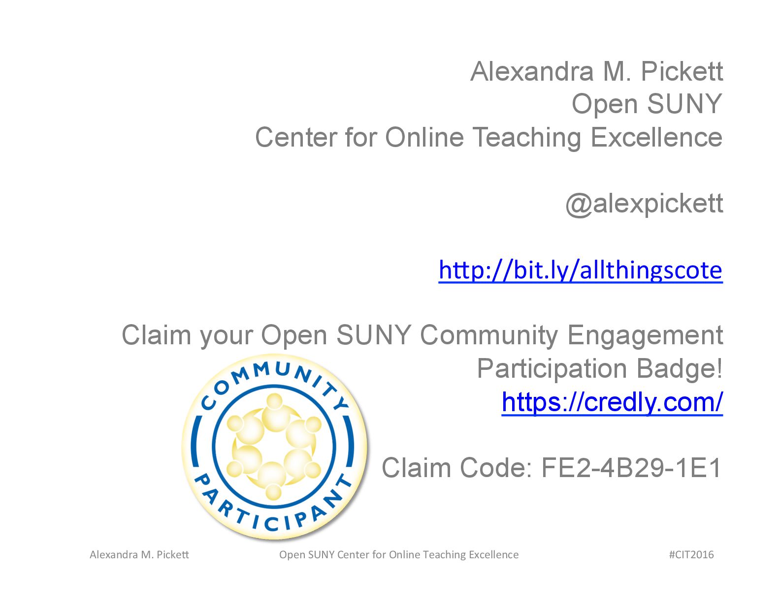 Excellence #CIT2016 Alexandra M. Pickett Open SUNY Center for Online Teaching Excellence @alexpickett h0p://bit.ly/allthingscote Claim your Open SUNY Community Engagement Participation Badge! https://credly.com/ Claim Code: FE2-4B29-1E1