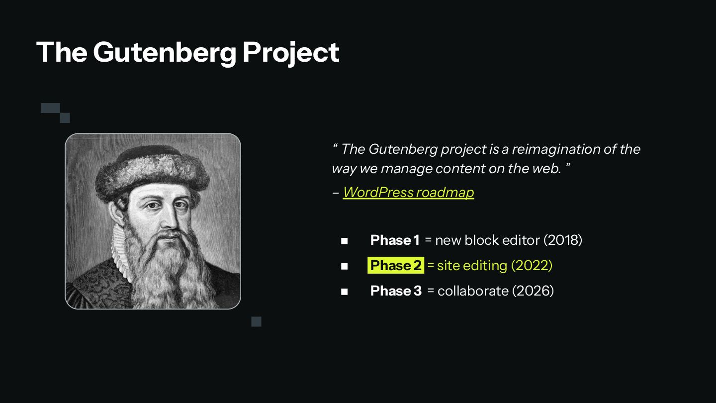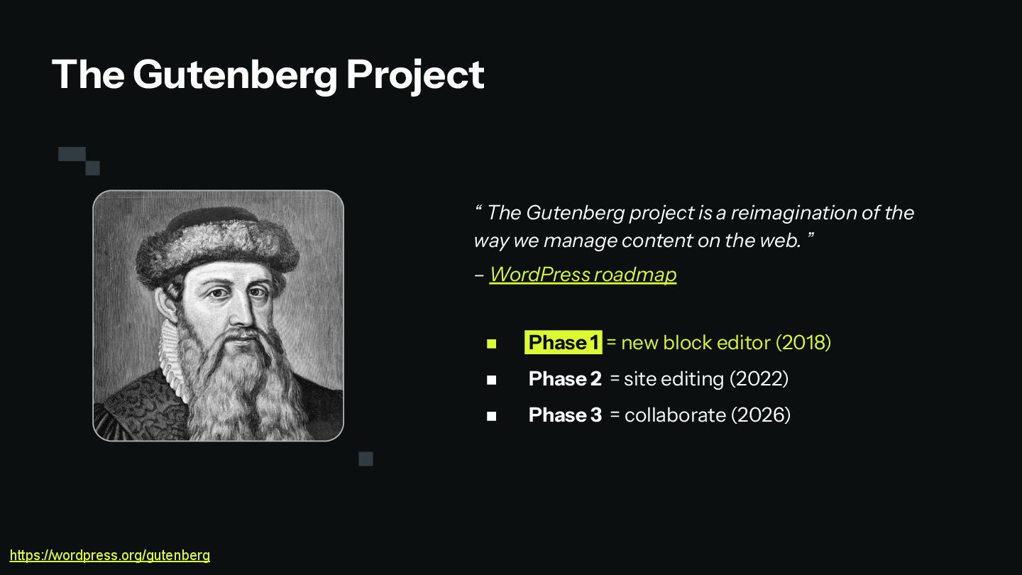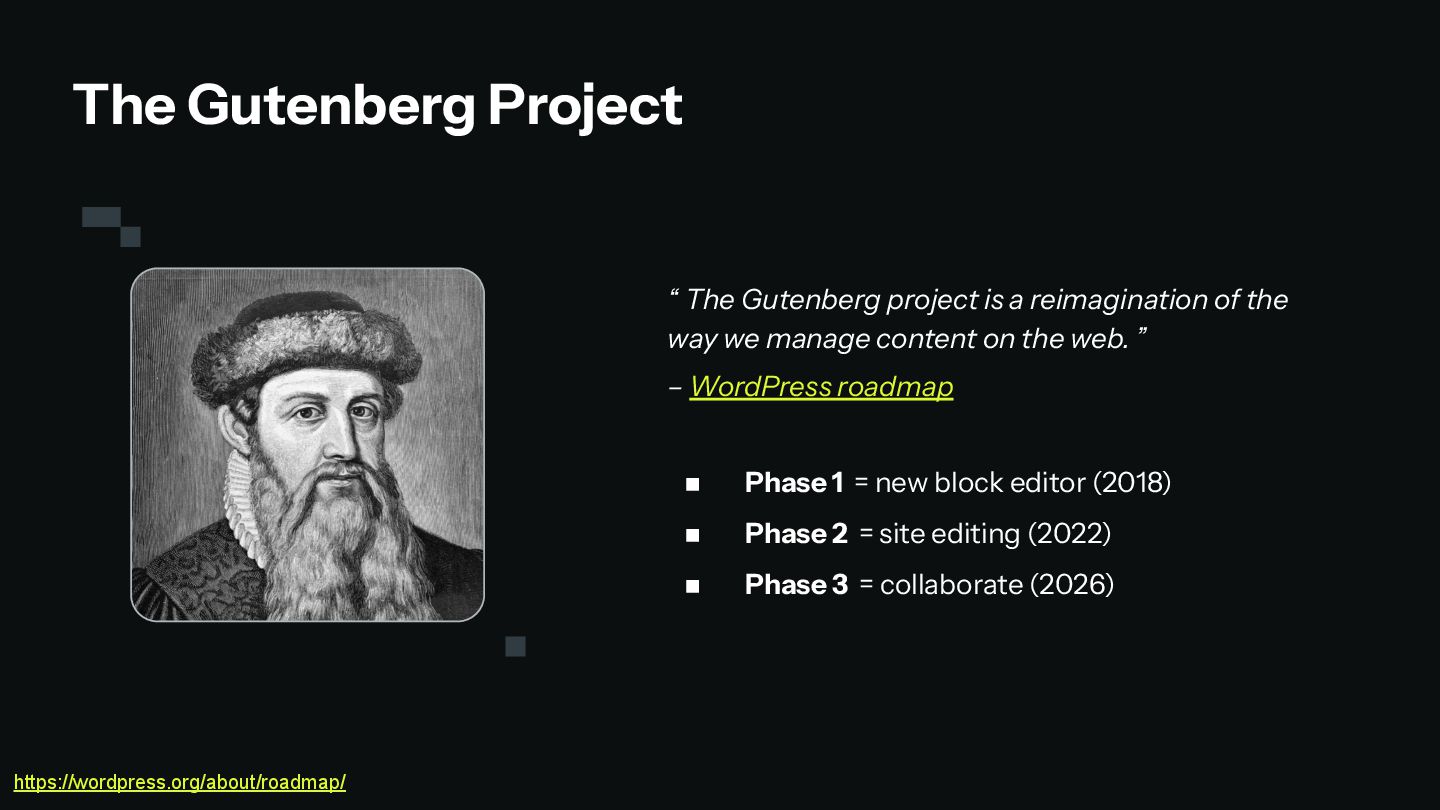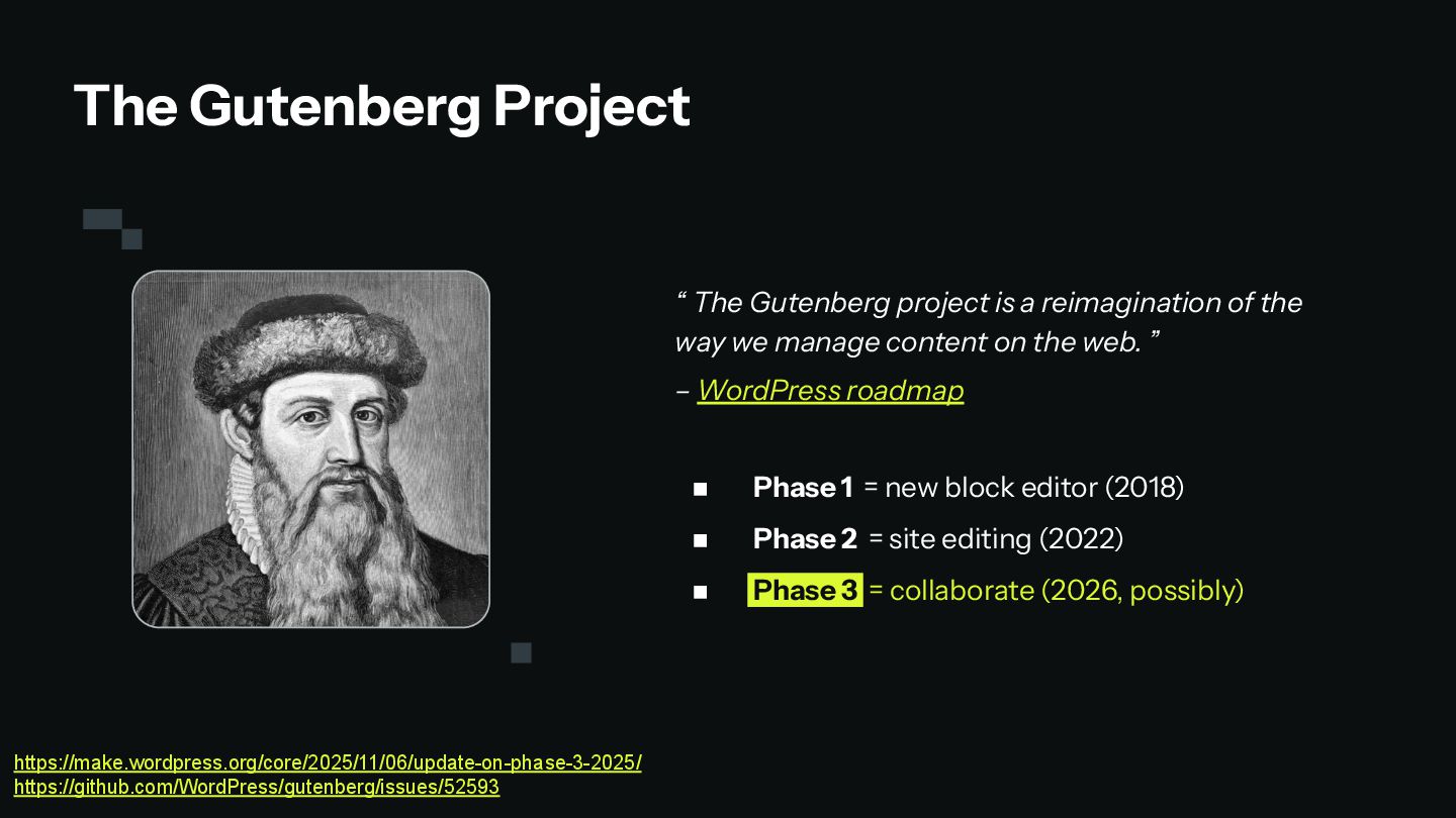 of the way we manage content on the web. ” – WordPress roadmap ◼ Phase 1 = new block editor (2018) ◼ Phase 2 = site editing (2022) ◼ Phase 3 = collaborate (2026, possibly) https://make.wordpress.org/core/2025/11/06/update-on-phase-3-2025/ https://github.com/WordPress/gutenberg/issues/52593