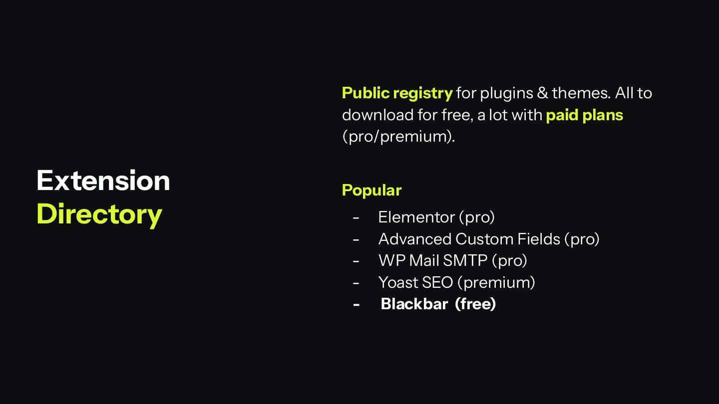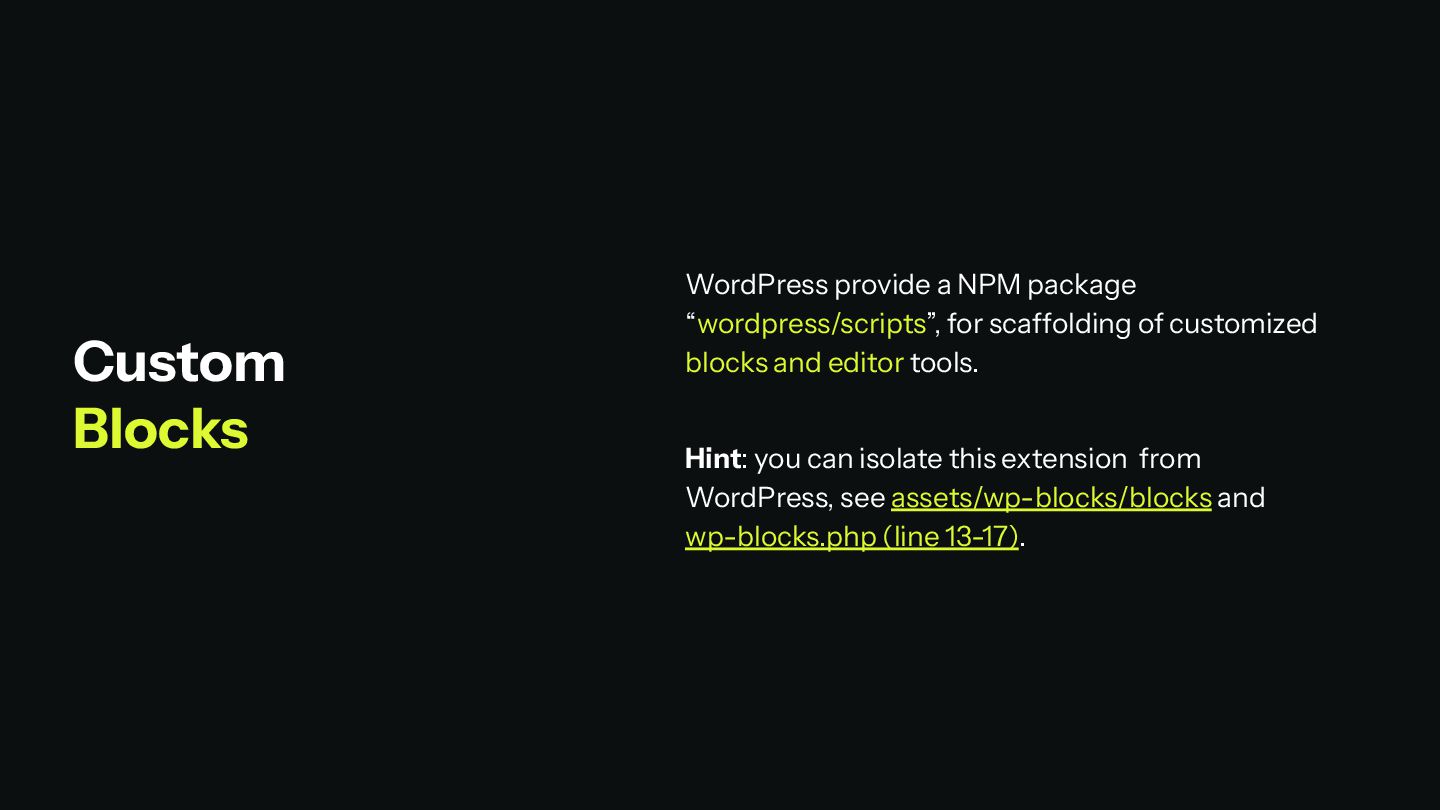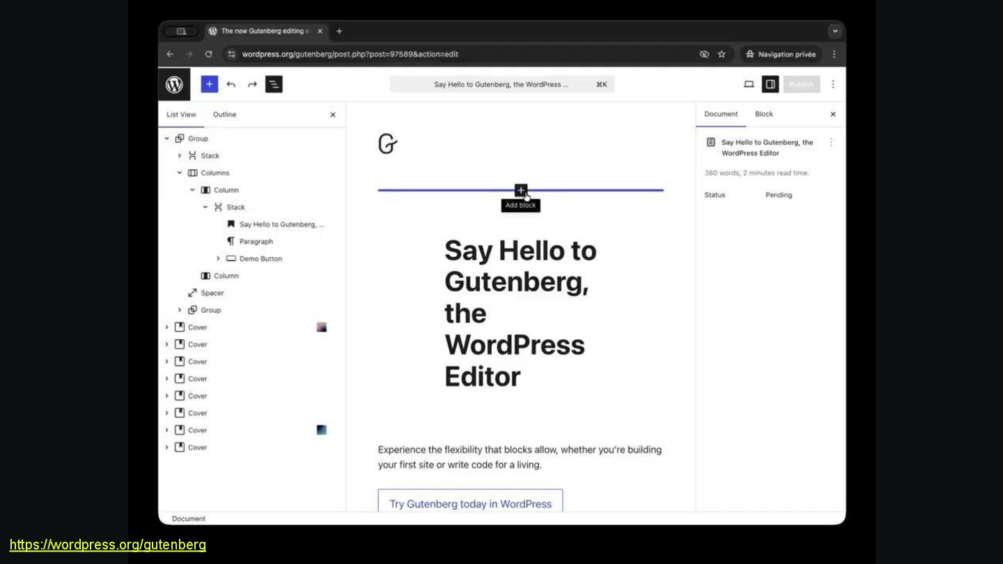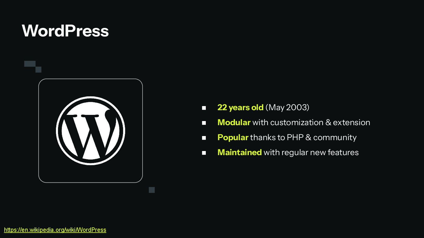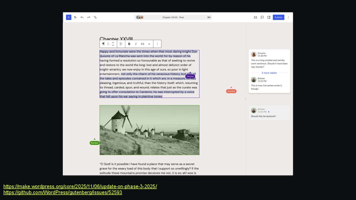 of the way we manage content on the web. ” – WordPress roadmap ◼ Phase 1 = new block editor (2018) ◼ Phase 2 = site editing (2022) ◼ Phase 3 = collaborate (2026, possibly) https://make.wordpress.org/core/2025/11/06/update-on-phase-3-2025/ https://github.com/WordPress/gutenberg/issues/52593
