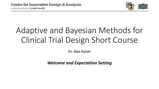 the basics of adaptive and Bayesian clinical trial methodology, either to broaden their knowledge of public health and clinical research, or to obtain a basis for more advanced study of the design and conduct of clinical trials. • This course is a survey of multiple topics, with the goal of providing knowledge on resources and code examples to further explore topics of interest in the future. 6