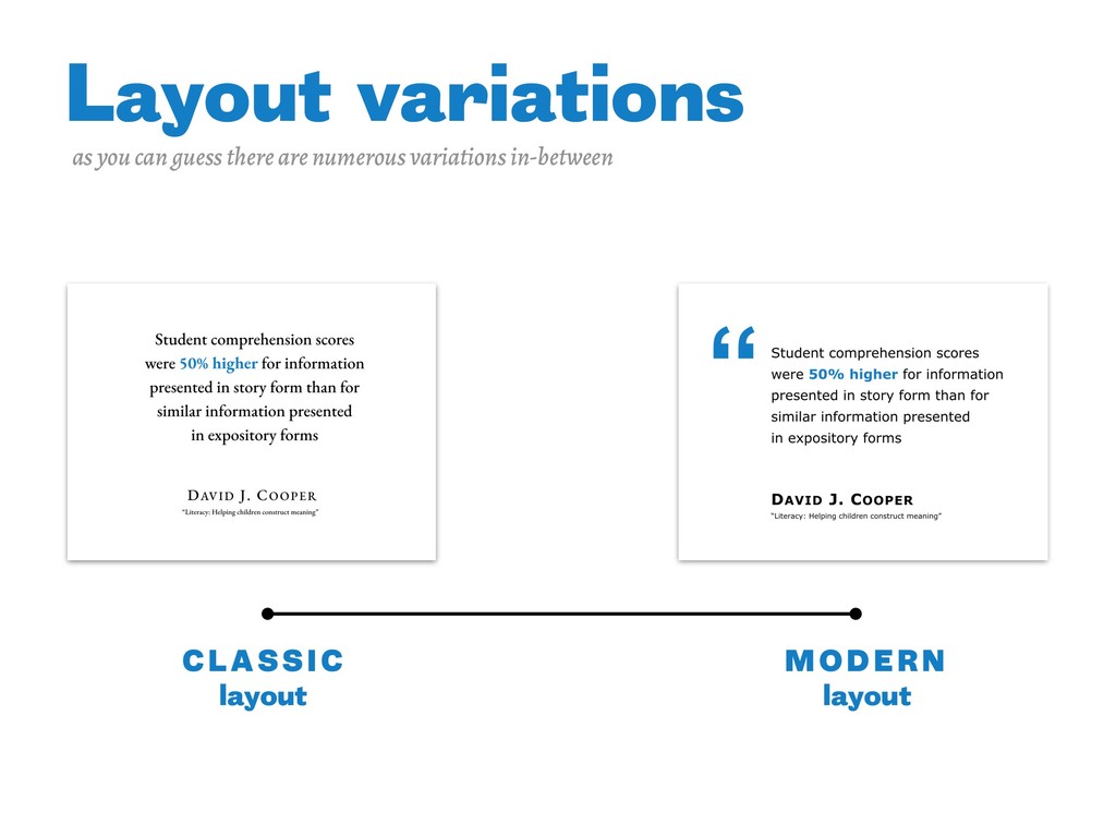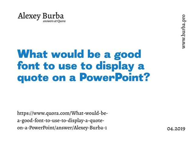 there are 2 fonts: a primary for a body text and a secondary for occasional use • If there is only one font — try to make a quote slide distinguishable by its layout (see step 3) No brand book — choose a font that pairs nicely with your main body font • Learn how to pair fonts — http://bit.ly/2XlMPLJ • In short — it is easier to pair sans-serif fonts with serif fonts. • If in doubt — just use a serif font for a quote Use an appropriate layout for the selected font • Serif fonts look better in a symmetrical layout • Sans-serif fonts look better in a left-align layout What would be a good font to use to display a quote on a PowerPoint? 1 2 3