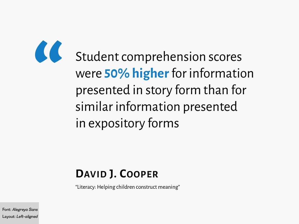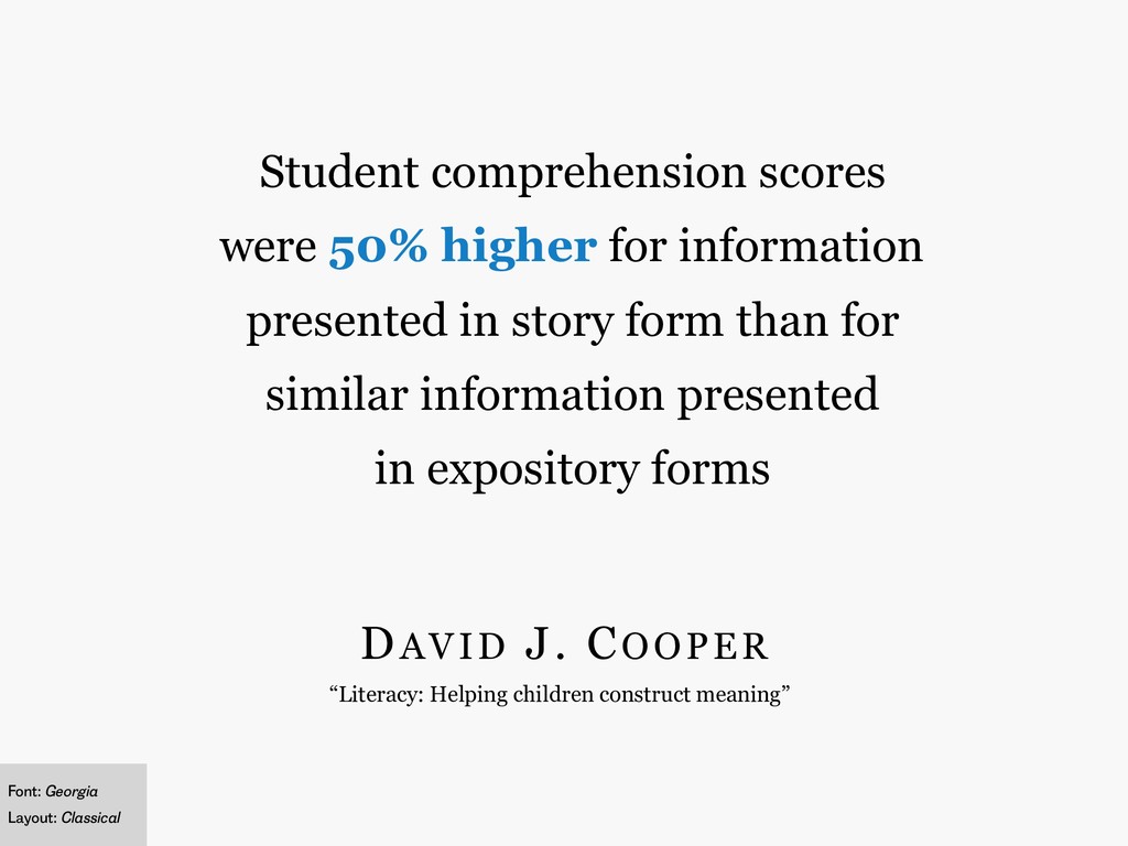 scores were 50% higher for information presented in story form than for similar information presented in expository forms Font: Georgia Layout: Classical