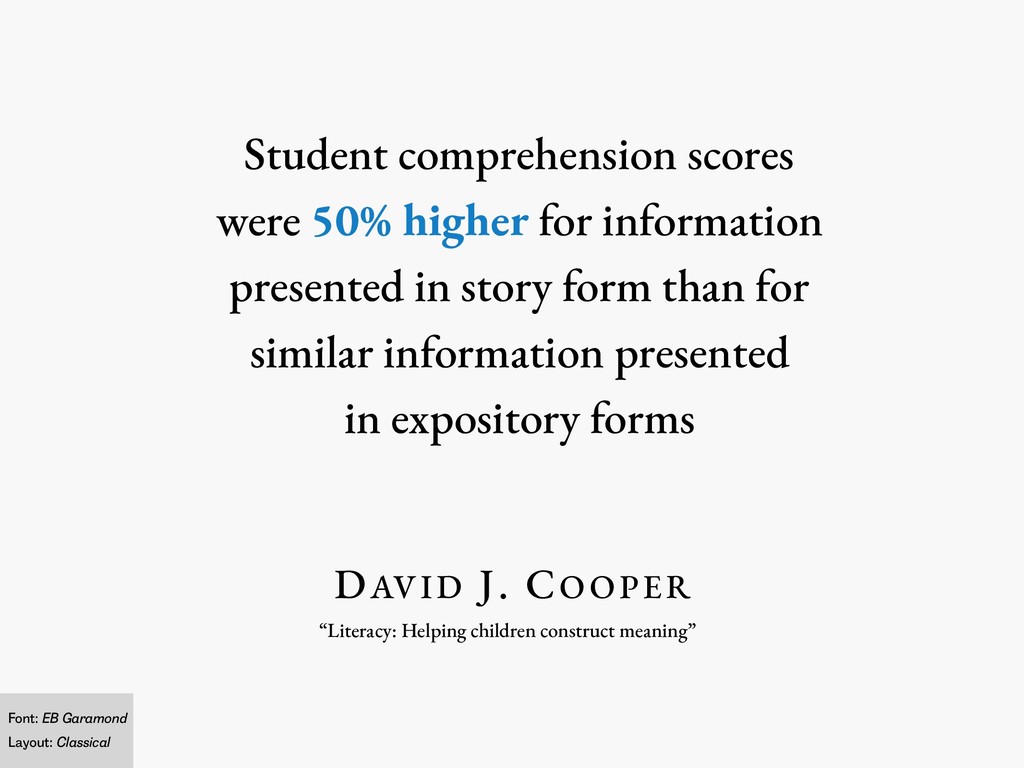 scores were 50% higher for information presented in story form than for similar information presented in expository forms Font: EB Garamond Layout: Classical