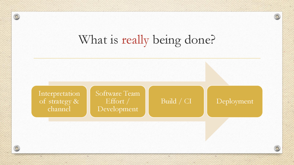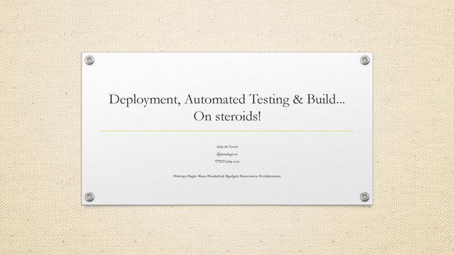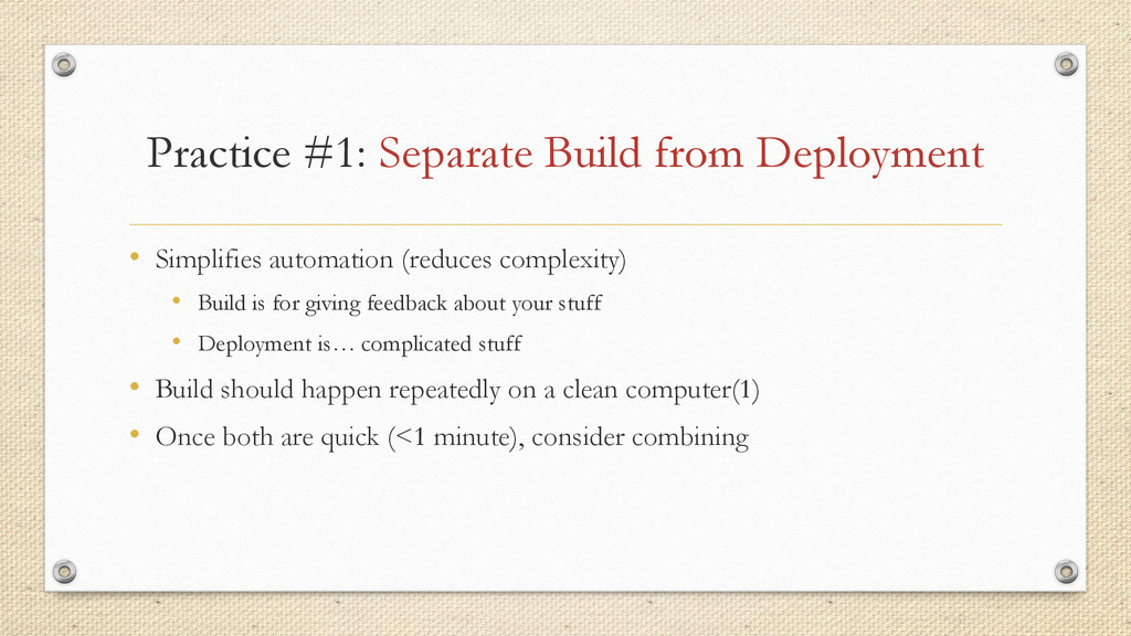 complexity) • Build is for giving feedback about your stuff • Deployment is… complicated stuff • Build should happen repeatedly on a clean computer(1) • Once both are quick (<1 minute), consider combining