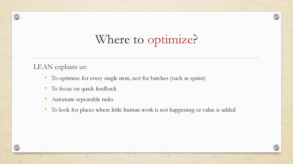 every single item, not for batches (such as sprint) • To focus on quick feedback • Automate repeatable tasks • To look for places where little human work is not happening or value is added