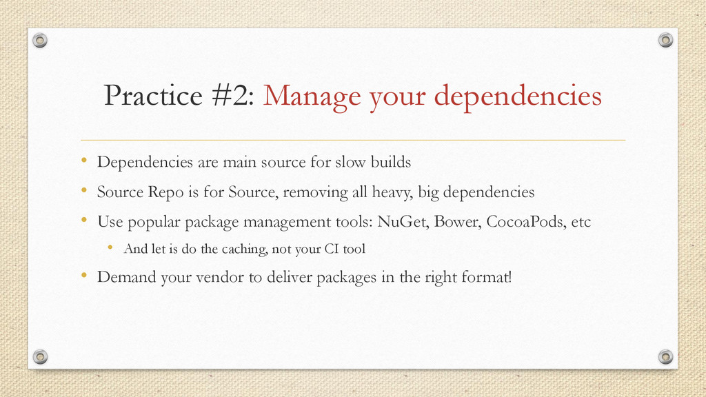 for slow builds • Source Repo is for Source, removing all heavy, big dependencies • Use popular package management tools: NuGet, Bower, CocoaPods, etc • And let is do the caching, not your CI tool • Demand your vendor to deliver packages in the right format!