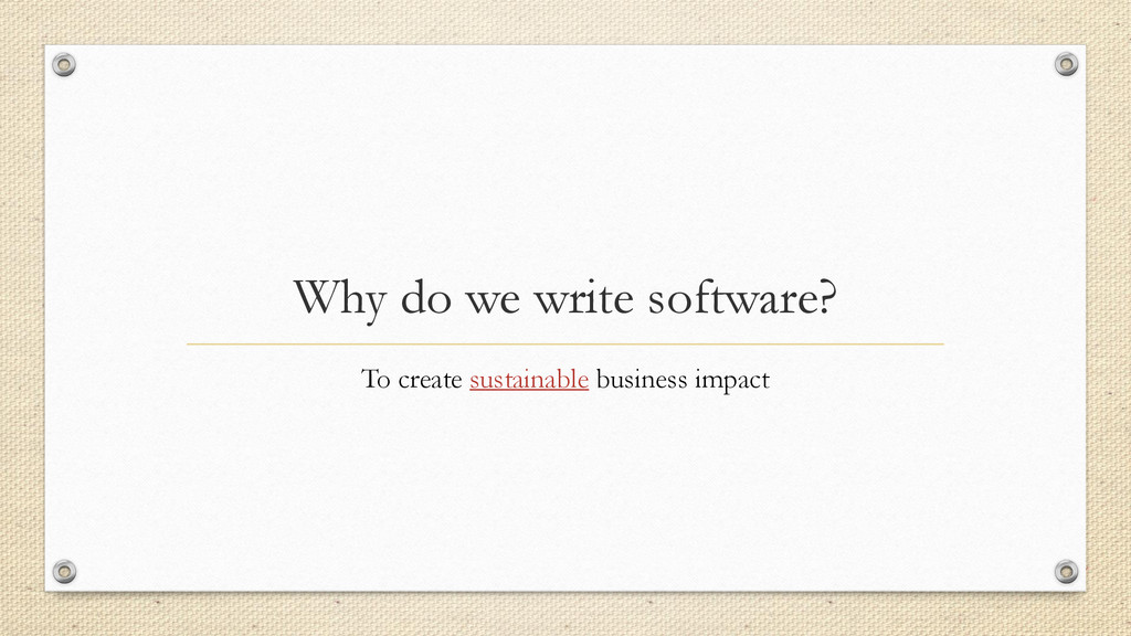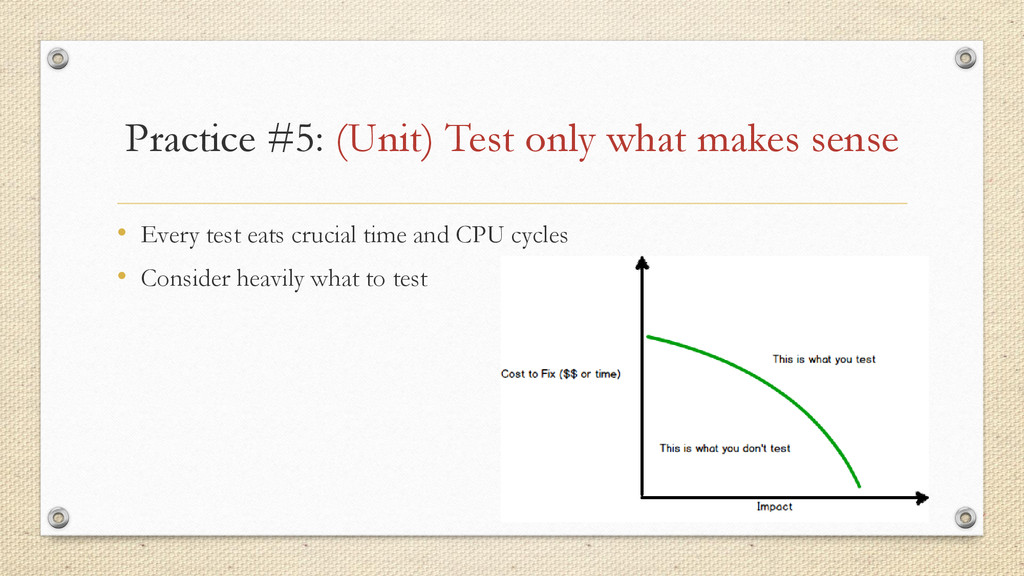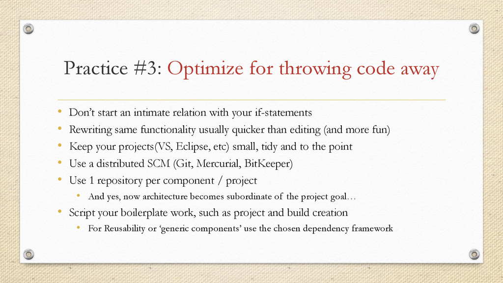 an intimate relation with your if-statements • Rewriting same functionality usually quicker than editing (and more fun) • Keep your projects(VS, Eclipse, etc) small, tidy and to the point • Use a distributed SCM (Git, Mercurial, BitKeeper) • Use 1 repository per component / project • And yes, now architecture becomes subordinate of the project goal… • Script your boilerplate work, such as project and build creation • For Reusability or ‘generic components’ use the chosen dependency framework