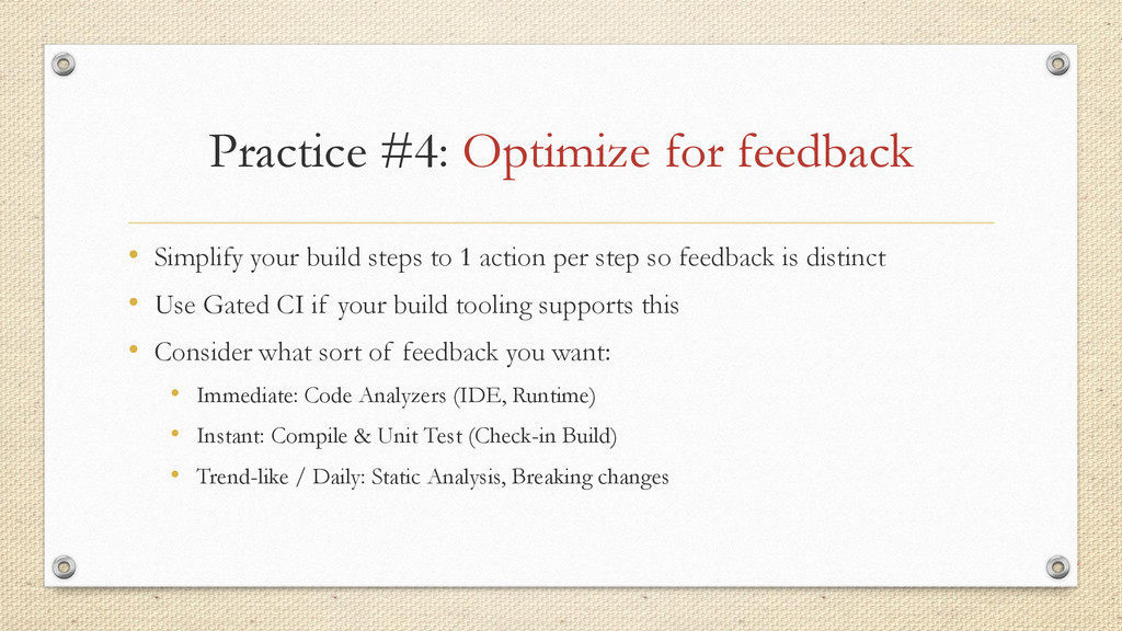to 1 action per step so feedback is distinct • Use Gated CI if your build tooling supports this • Consider what sort of feedback you want: • Immediate: Code Analyzers (IDE, Runtime) • Instant: Compile & Unit Test (Check-in Build) • Trend-like / Daily: Static Analysis, Breaking changes