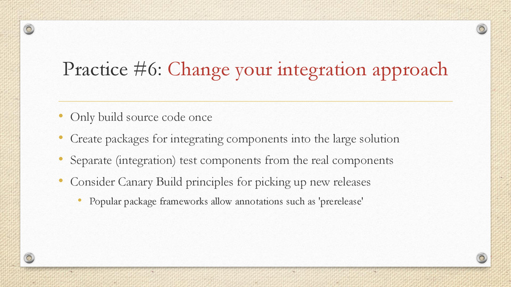 code once • Create packages for integrating components into the large solution • Separate (integration) test components from the real components • Consider Canary Build principles for picking up new releases • Popular package frameworks allow annotations such as 'prerelease'