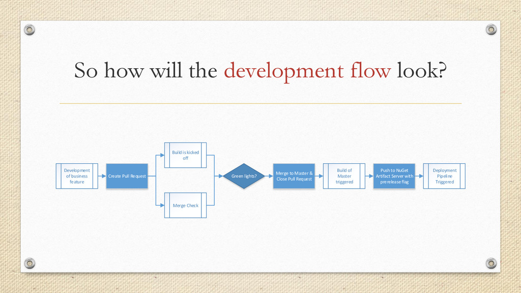 feature Create Pull Request Build is kicked off Merge Check Green lights? Merge to Master & Close Pull Request Build of Master triggered Push to NuGet Artifact Server with prerelease flag Deployment Pipeline Triggered