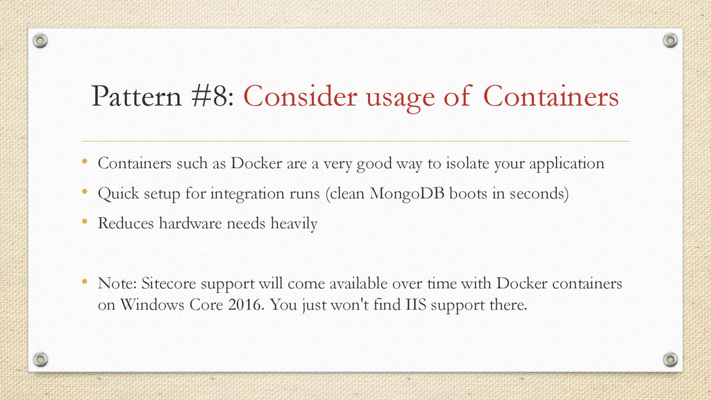 Docker are a very good way to isolate your application • Quick setup for integration runs (clean MongoDB boots in seconds) • Reduces hardware needs heavily • Note: Sitecore support will come available over time with Docker containers on Windows Core 2016. You just won't find IIS support there.