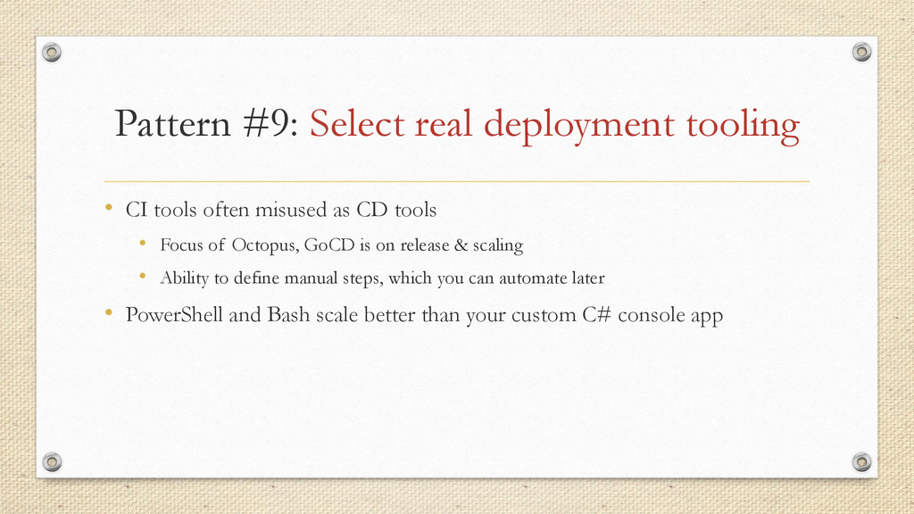 misused as CD tools • Focus of Octopus, GoCD is on release & scaling • Ability to define manual steps, which you can automate later • PowerShell and Bash scale better than your custom C# console app
