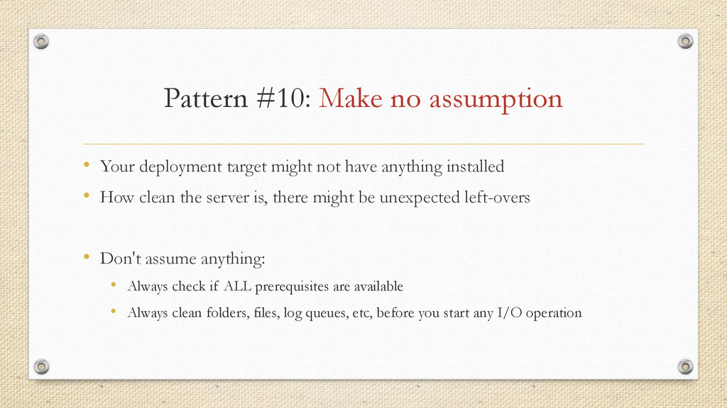 not have anything installed • How clean the server is, there might be unexpected left-overs • Don't assume anything: • Always check if ALL prerequisites are available • Always clean folders, files, log queues, etc, before you start any I/O operation