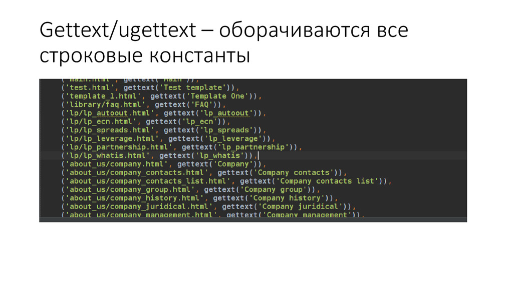 пар строк MSGID: MSGSTR • Пригоден для перевода переводчиком • Кроме переводов, содержит комментарии и служебные отметки • Существуют удобные утилиты (PoEdit) • Пригоден для редактирования в текстовом редакторе
