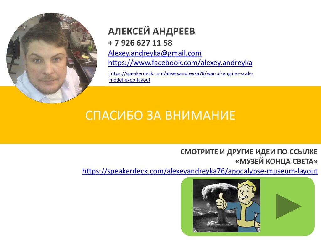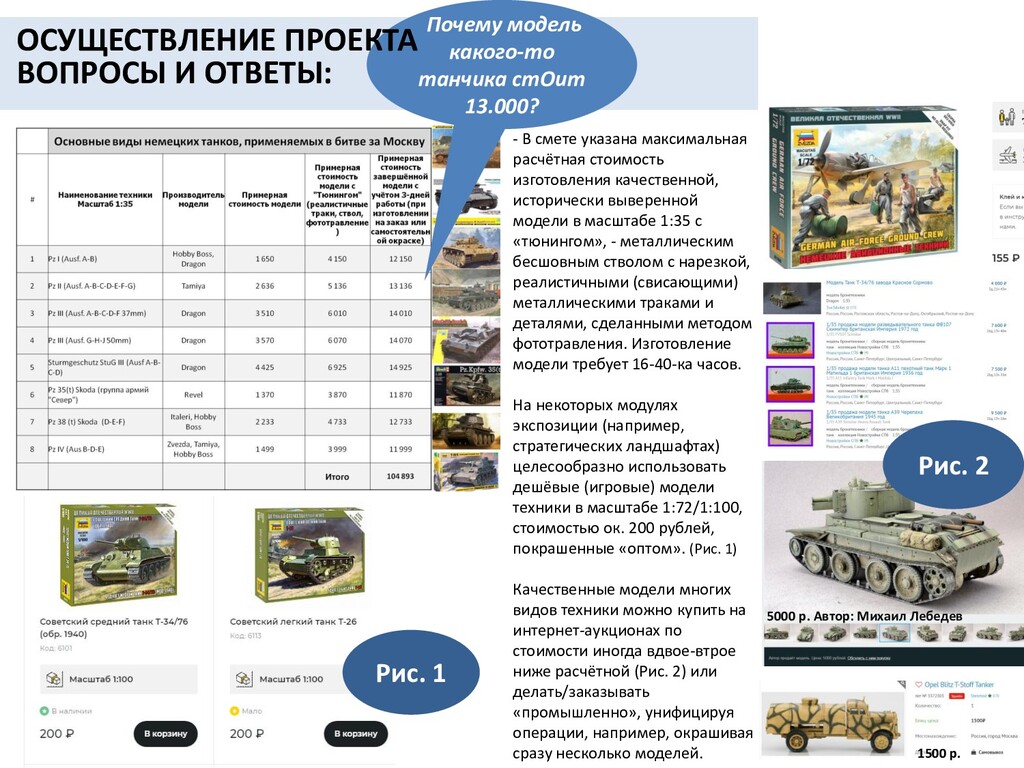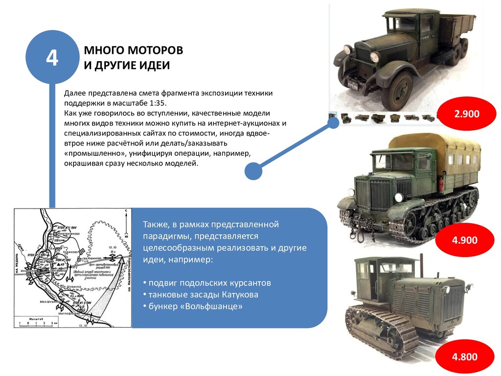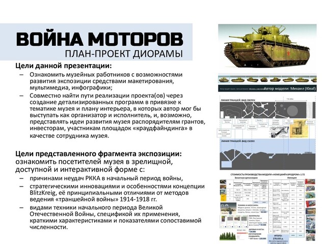 городить, макетировать-анимировать??! - Во-первых, это красиво! Во-вторых, представляется, что современный музей должен в значительной мере учитывать особенности восприятия информации молодыми гаджетизированными поколениями: -"клиповое" восприятие, обусловленное обилием и спецификой информационных источников, - приоритет визуальной, а не вербальной составляющей, отсутствие навыка долговременной концентрации – не тренированы читать, - ожидание развлечения в образовании (термин "Edutainment"(Education+Entertainment) уверенно входит в педагогический обиход). - Что им теперь, мультики показывать? – Да. - Из каких источников планируется финансировать проект(ы)? - Музейные гранты, такие как Фонда Потанина, Военно-Патриотического общества. - Партнёрские программы, например, площадки краудфайндинга (общественного финансирования), - Конкурсы в тематических интернет-сообществах, например, любителей истории и моделистов. - Бюджетные средства, например, Министерства Культуры или Минобороны. Система госзакупок, однако, может осложнить гибкое эффективное осуществление и сделать организацию проекта более трудоёмкой. Из чего складывается стоимость макета? Что влияет на стоимость? - Стоимость материалов, инструментов, сборных моделей, рабочего времени исполнителей, размер объекта (модуля) и степень желаемой детализации. - Городской ландшафт дороже сельского, масштаб моделей техники 1:35 дороже масштаба 1:72, найденная на помойке дверь дешевле изготовленного из фанеры подмакетника.. Остекление, подсветка, не/исполнение заднего фона, не/использование проектора, наличие интерактивных элементов (например, действующей железной дороги или аэродрома). - Проект возможно удешевить без значительной потери качества, проявив изобретательность, например, покупая китайские, а не немецкие кусты и деревья, текстурные панели и листы ПВХ вместо готовых сараев и заборов, используя прибрежный песок и грунт для аквариумных рыбок вместо дорогих «присыпок». Но он всё равно не будет дешёвым и сделанным по-быстренькому.