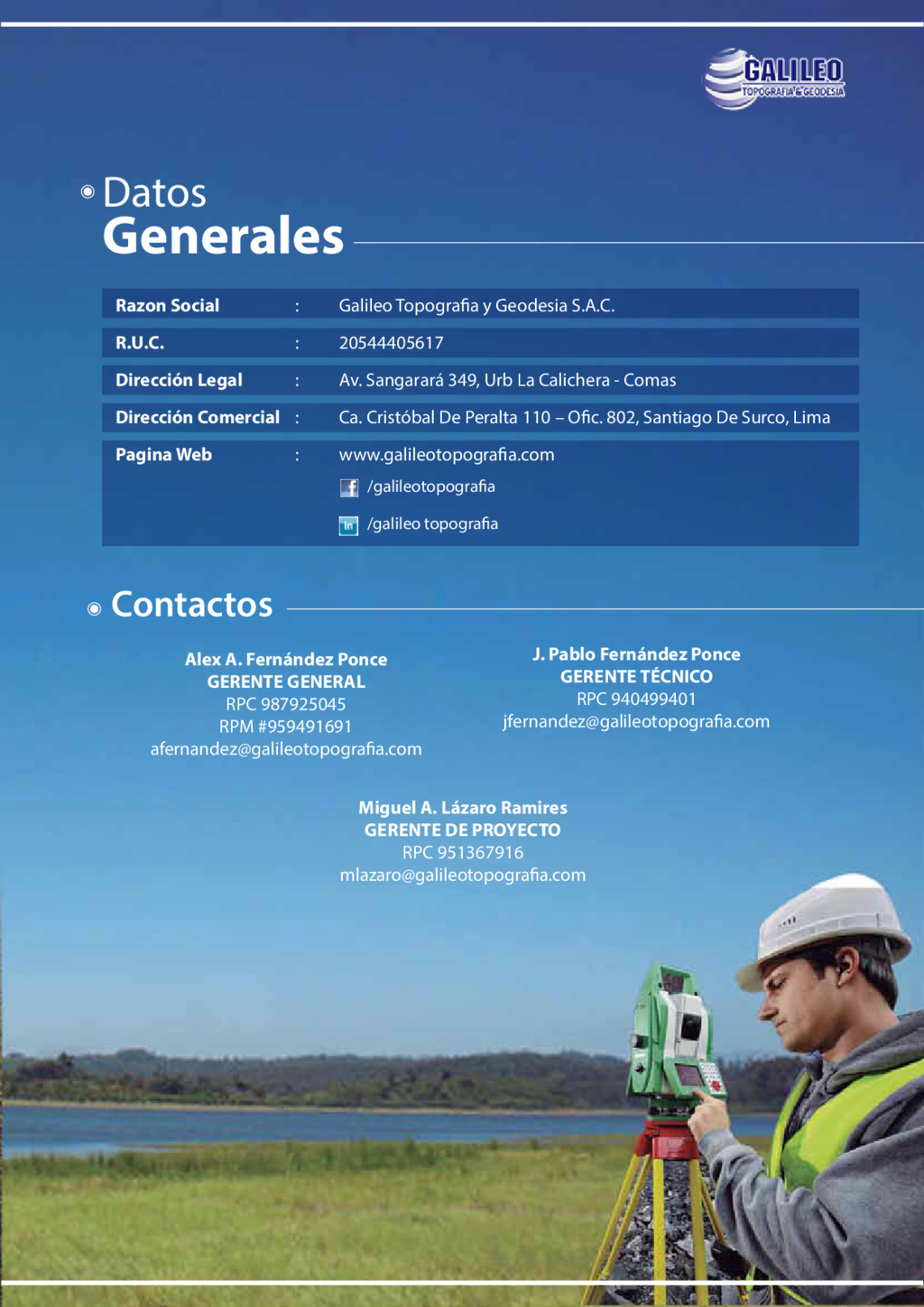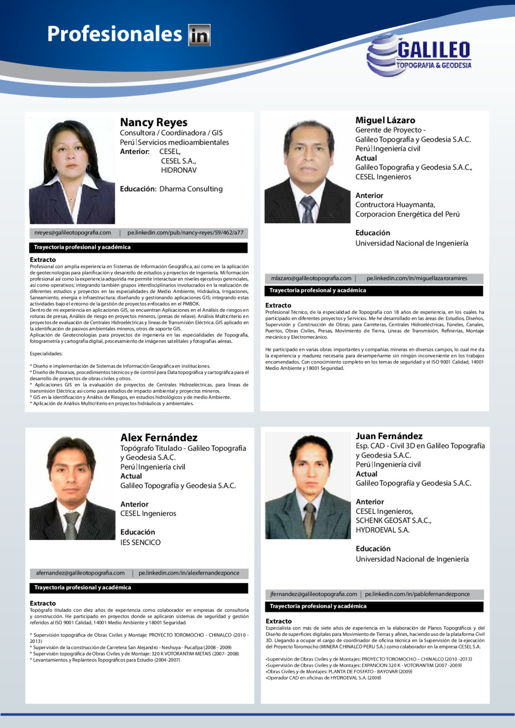 medioambientales Anterior: CESEL, CESEL S.A., HIDRONAV Educación: Dharma Consulting Alex Fernández Topógrafo Titulado - Galileo Topografía y Geodesia S.A.C. Perú Ingeniería civil Actual Galileo Topografía y Geodesia S.A.C. Anterior CESEL Ingenieros Educación IES SENCICO Miguel Lázaro Gerente de Proyecto - Galileo Topografía y Geodesia S.A.C. Perú Ingeniería civil Actual Galileo Topografia y Geodesia S.A.C., CESEL Ingenieros Anterior Contructora Huaymanta, Corporacion Energética del Perú Educación Universidad Nacional de Ingeniería Juan Fernández Esp. CAD - Civil 3D en Galileo Topografía y Geodesia S.A.C. Perú Ingeniería civil Actual Galileo Topografía y Geodesia S.A.C. Anterior CESEL Ingenieros, SCHENK GEOSAT S.A.C., HYDROEVAL S.A. Educación Universidad Nacional de Ingeniería Extracto Profesional con amplia experiencia en Sistemas de Información Geográfica, así como en la aplicación de geotecnologías para planificación y desarrollo de estudios y proyectos de ingeniería. Mi formación profesional así como la experiencia adquirida me permite interactuar en niveles ejecutivos gerenciales, así como operativos; integrando también grupos interdisciplinarios involucrados en la realización de diferentes estudios y proyectos en las especialidades de Medio Ambiente, Hidráulica, Irrigaciones, Saneamiento, energía e infraestructura; diseñando y gestionando aplicaciones GIS; integrando estas actividades bajo el entorno de la gestión de proyectos enfocados en el PMBOK. Dentro de mi experiencia en aplicaciones GIS, se encuentran Aplicaciones en el Análisis de riesgos en roturas de presas, Análisis de riesgo en proyectos mineros, (presas de relave). Análisis Multicriterio en proyectos de evaluación de Centrales Hidroeléctricas y líneas de Transmisión Eléctrica. GIS aplicado en la identificación de pasivos ambientales mineros, otros de soporte GIS. Aplicación de Geotecnologías para proyectos de ingeniería en las especialidades de Topografía, fotogrametría y cartografía digital, procesamiento de imágenes satelitales y fotografías aéreas. Especialidades: * Diseño e implementación de Sistemas de Información Geográfica en instituciones. * Diseño de Procesos, procedimientos técnicos y de control para Data topográfica y cartográfica para el desarrollo de proyectos de obras civiles y otros. * Aplicaciones GIS en la evaluación de proyectos de Centrales Hidroeléctricas, para líneas de transmisión Eléctrica; así como para estudios de impacto ambiental y proyectos mineros. * GIS en la identificación y Análisis de Riesgos, en estudios hidrológicos y de medio Ambiente. * Aplicación de Análisis Multicriterio en proyectos hidráulicos y ambientales. Extracto Topógrafo titulado con diez años de experiencia como colaborador en empresas de consultoría y construcción. He participado en proyectos donde se aplicaron sistemas de seguridad y gestión referidos al ISO 9001 Calidad, 14001 Medio Ambiente y 18001 Seguridad. * Supervisión topográfica de Obras Civiles y Montaje: PROYECTO TOROMOCHO - CHINALCO (2010 - 2013) * Supervisión de la construcción de Carretera San Alejandro - Neshuya - Pucallpa (2008 - 2009) * Supervisión topográfica de Obras Civiles y de Montaje: 320 K VOTORANTIM METAIS (2007- 2008) * Levantamientos y Replanteos Topográficos para Estudio (2004-2007) Extracto Profesional Técnico, de la especialidad de Topografía con 18 años de experiencia, en los cuales ha participado en diferentes proyectos y Servicios. Me he desarrollado en las áreas de: Estudios, Diseños, Supervisión y Construcción de Obras; para Carreteras, Centrales Hidroeléctricas, Túneles, Canales, Puertos, Obras Civiles, Presas, Movimiento de Tierra, Líneas de Transmisión, Refinerías, Montaje mecánico y Electromecánico. He participado en varias obras importantes y compañías mineras en diversos campos, lo cual me da la experiencia y madurez necesaria para desempeñarme sin ningún inconveniente en los trabajos encomendados. Con conocimiento completo en los temas de seguridad y el ISO 9001 Calidad, 14001 Medio Ambiente y 18001 Seguridad. Extracto Especialista con más de siete años de experiencia en la elaboración de Planos Topográficos y del Diseño de superficies digitales para Movimiento de Tierras y afines, haciendo uso de la plataforma Civil 3D. Llegando a ocupar el cargo de coordinador de oficina técnica en la Supervisión de la ejecución del Proyecto Toromocho (MINERA CHINALCO PERU S.A.) como colaborador en la empresa CESEL S.A. •Supervisión de Obras Civiles y de Montajes: PROYECTO TOROMOCHO – CHINALCO (2010 -2013) •Supervisión de Obras Civiles y de Montajes: EXPANCION 320 K - VOTORANTIM (2007 -2009) •Obras Civiles y de Montajes: PLANTA DE FOSFATO - BAYOVAR (2009) •Operador CAD en oficinas de HYDROEVAL S.A. (2008)