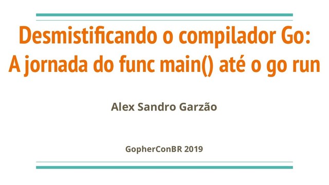 Repositório do go: gc está aqui ◦ Introduction to the go compiler ◦ Go contribution guide ◦ SSA rules • Porque reescreveram o gc em go e como • Adding a new statement: part 1 and part 2 • Go toolchain • Hacking go compiler internals • Para gerar SSA: GOSSAFUNC=main go tool compile hello.go (gera ssa.html) • Compiler explorer • Aho, 2nd editon