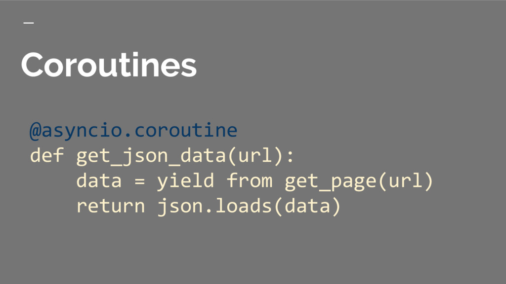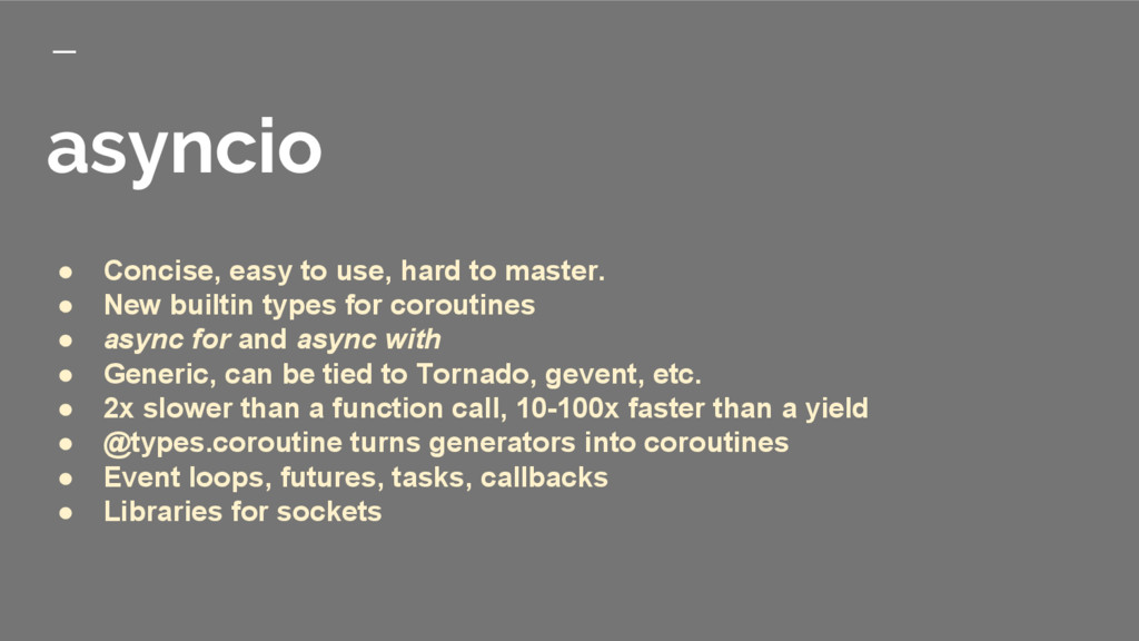 New builtin types for coroutines • async for and async with • Generic, can be tied to Tornado, gevent, etc. • 2x slower than a function call, 10-100x faster than a yield • @types.coroutine turns generators into coroutines • Event loops, futures, tasks, callbacks • Libraries for sockets