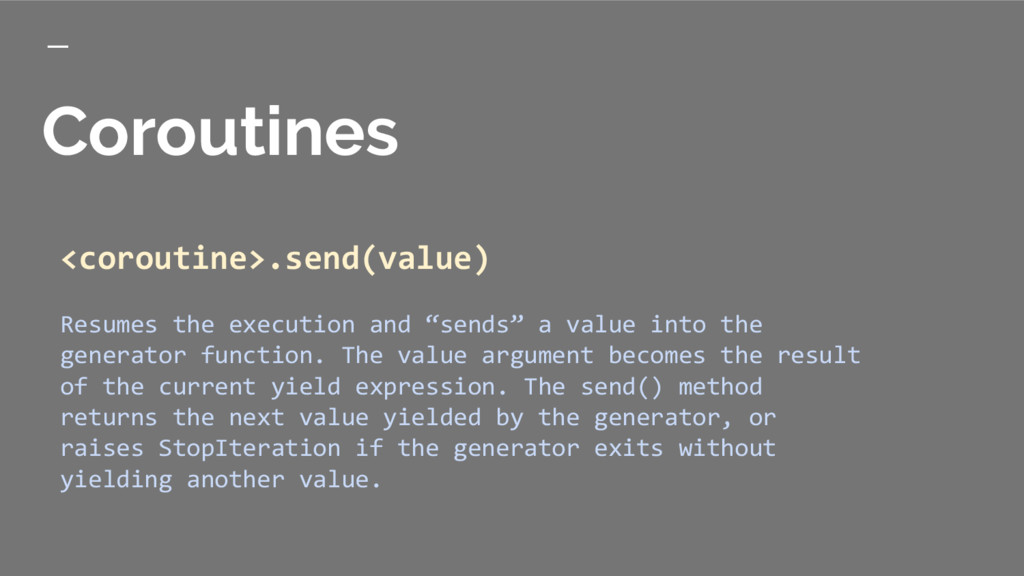 the generator function. The value argument becomes the result of the current yield expression. The send() method returns the next value yielded by the generator, or raises StopIteration if the generator exits without yielding another value.