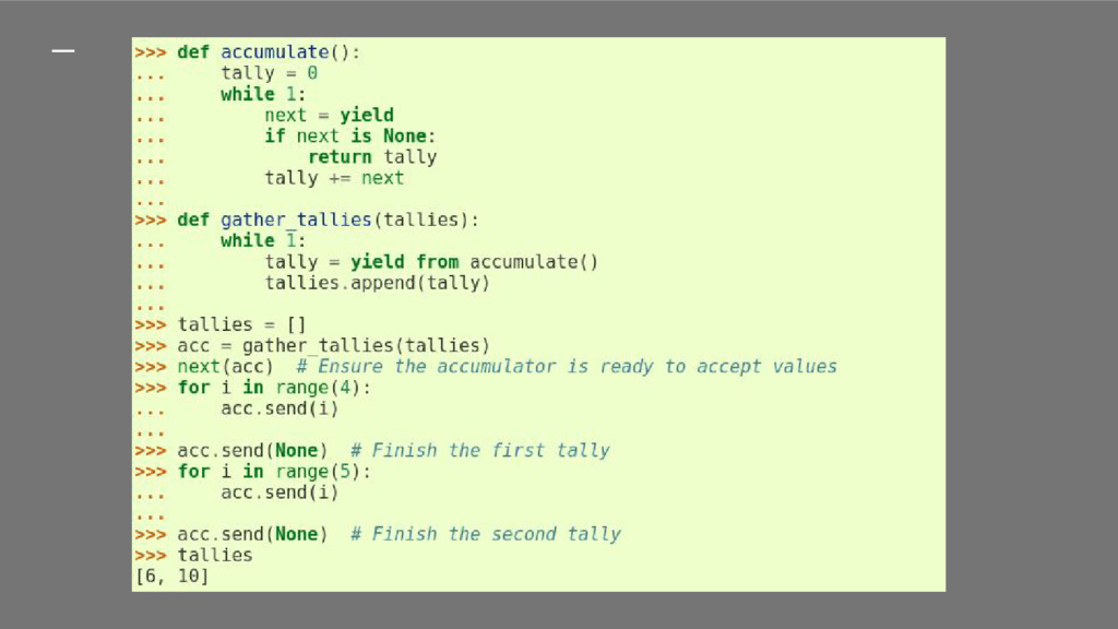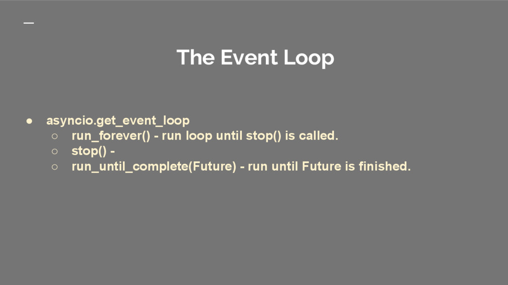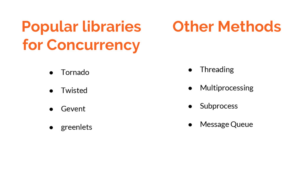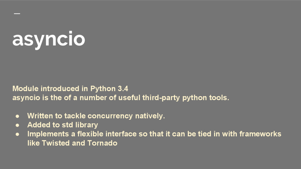 a number of useful third-party python tools. • Written to tackle concurrency natively. • Added to std library • Implements a flexible interface so that it can be tied in with frameworks like Twisted and Tornado