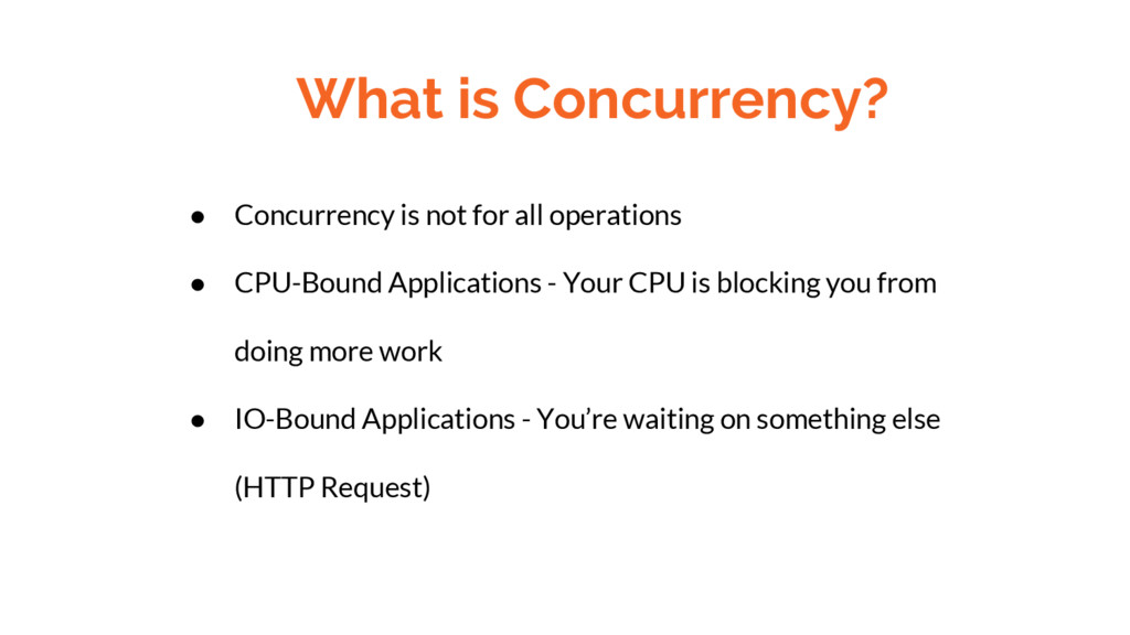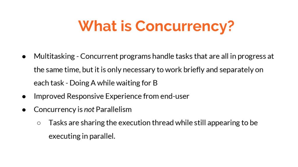 that are all in progress at the same time, but it is only necessary to work briefly and separately on each task - Doing A while waiting for B • Improved Responsive Experience from end-user • Concurrency is not Parallelism ◦ Tasks are sharing the execution thread while still appearing to be executing in parallel.
