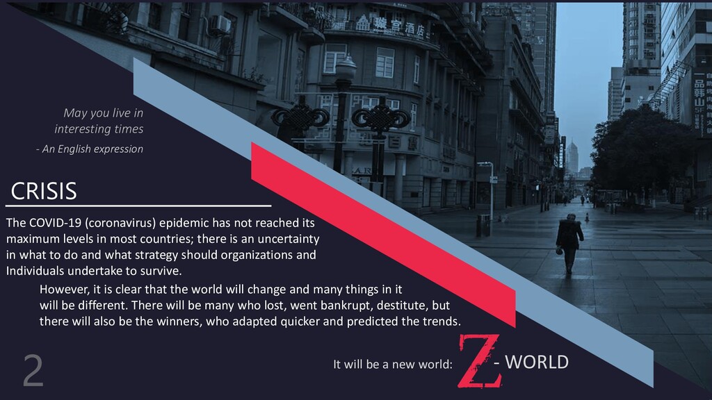 levels in most countries; there is an uncertainty in what to do and what strategy should organizations and Individuals undertake to survive. However, it is clear that the world will change and many things in it will be different. There will be many who lost, went bankrupt, destitute, but there will also be the winners, who adapted quicker and predicted the trends. May you live in interesting times - An English expression It will be a new world: - WORLD