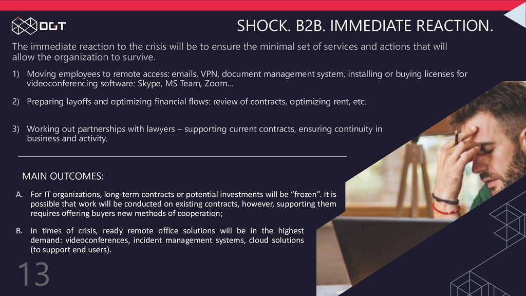 emails, VPN, document management system, installing or buying licenses for videoconferencing software: Skype, MS Team, Zoom… 2) Preparing layoffs and optimizing financial flows: review of contracts, optimizing rent, etc. The immediate reaction to the crisis will be to ensure the minimal set of services and actions that will allow the organization to survive. 3) Working out partnerships with lawyers – supporting current contracts, ensuring continuity in business and activity. MAIN OUTCOMES: A. For IT organizations, long-term contracts or potential investments will be “frozen”. It is possible that work will be conducted on existing contracts, however, supporting them requires offering buyers new methods of cooperation; B. In times of crisis, ready remote office solutions will be in the highest demand: videoconferences, incident management systems, cloud solutions (to support end users).