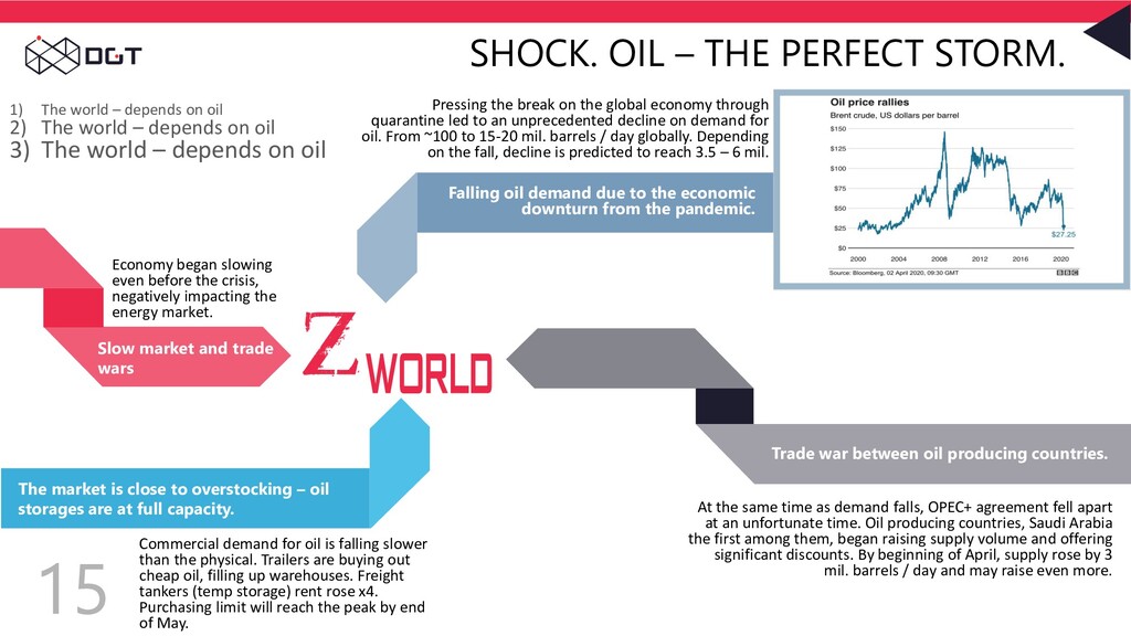 to the economic downturn from the pandemic. Trade war between oil producing countries. The market is close to overstocking – oil storages are at full capacity. Pressing the break on the global economy through quarantine led to an unprecedented decline on demand for oil. From ~100 to 15-20 mil. barrels / day globally. Depending on the fall, decline is predicted to reach 3.5 – 6 mil. At the same time as demand falls, OPEC+ agreement fell apart at an unfortunate time. Oil producing countries, Saudi Arabia the first among them, began raising supply volume and offering significant discounts. By beginning of April, supply rose by 3 mil. barrels / day and may raise even more. Commercial demand for oil is falling slower than the physical. Trailers are buying out cheap oil, filling up warehouses. Freight tankers (temp storage) rent rose x4. Purchasing limit will reach the peak by end of May. Economy began slowing even before the crisis, negatively impacting the energy market. Slow market and trade wars 1) The world – depends on oil 2) The world – depends on oil 3) The world – depends on oil