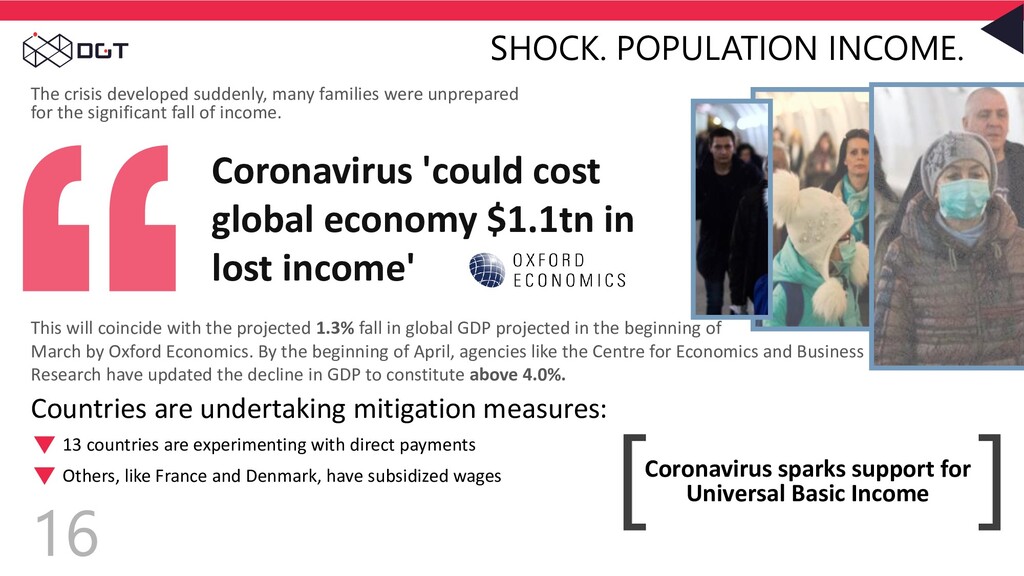 unprepared for the significant fall of income. Coronavirus 'could cost global economy $1.1tn in lost income' This will coincide with the projected 1.3% fall in global GDP projected in the beginning of March by Oxford Economics. By the beginning of April, agencies like the Centre for Economics and Business Research have updated the decline in GDP to constitute above 4.0%. Countries are undertaking mitigation measures: 13 countries are experimenting with direct payments Others, like France and Denmark, have subsidized wages Coronavirus sparks support for Universal Basic Income