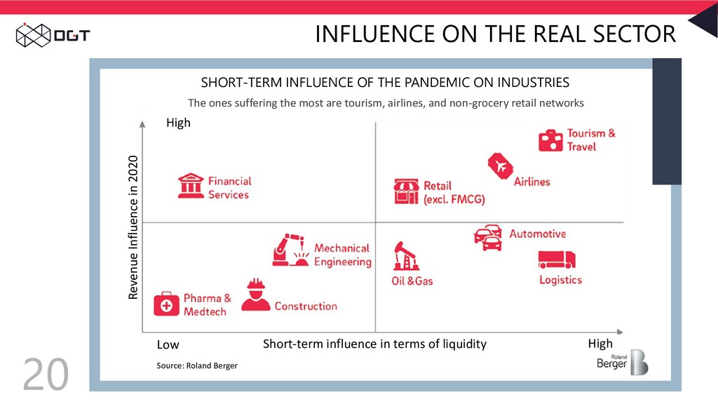 ON INDUSTRIES The ones suffering the most are tourism, airlines, and non-grocery retail networks Short-term influence in terms of liquidity Source: Roland Berger Revenue Influence in 2020 High Low High