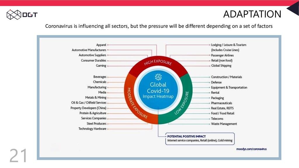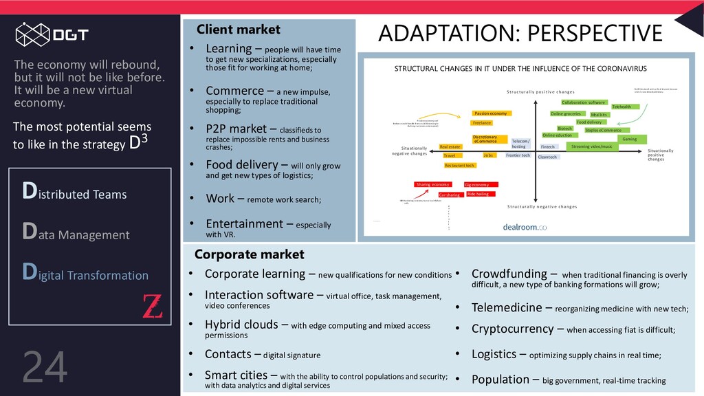 be like before. It will be a new virtual economy. Distributed Teams Data Management Digital Transformation Client market Corporate market • Learning – people will have time to get new specializations, especially those fit for working at home; • Commerce – a new impulse, especially to replace traditional shopping; • P2P market – classifieds to replace impossible rents and business crashes; • Food delivery – will only grow and get new types of logistics; • Work – remote work search; • Entertainment – especially with VR. • Corporate learning – new qualifications for new conditions • Interaction software – virtual office, task management, video conferences • Hybrid clouds – with edge computing and mixed access permissions • Contacts – digital signature • Smart cities – with the ability to control populations and security; with data analytics and digital services • Crowdfunding – when traditional financing is overly difficult, a new type of banking formations will grow; • Telemedicine – reorganizing medicine with new tech; • Cryptocurrency – when accessing fiat is difficult; • Logistics – optimizing supply chains in real time; • Population – big government, real-time tracking The most potential seems to like in the strategy D3 S ourc e:Dealroom .c o Structurally positive changes Structurally negative changes Situationally negative changes Food delivery Meal kits Online groceries Cleantech Ride hailing Car sharing Travel Collaboration software Jobs Freelance Restaurant tech Discretionary eCommerce Sharing economy Biotech Passion economy Gig economy Real estate Fintech Telecom/ hosting Frontier tech Staples eCommerce Both S tructural and cyclical impact,because crisis is was alreadyunderway W ill the sharing economy bunce back fullyor only p a r t i a l l y ? Online eduction Passion economy and freelance could benefit from social distancing in the long run (more controversial) Situationally positive changes Streaming video/music Gaming Telehealth STRUCTURAL CHANGES IN IT UNDER THE INFLUENCE OF THE CORONAVIRUS