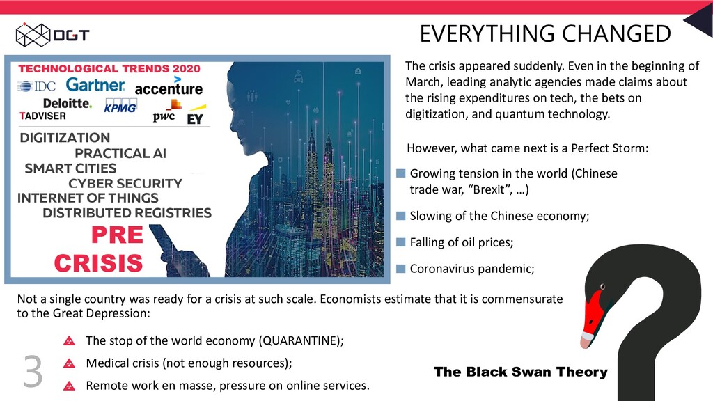 of March, leading analytic agencies made claims about the rising expenditures on tech, the bets on digitization, and quantum technology. However, what came next is a Perfect Storm: Growing tension in the world (Chinese trade war, “Brexit”, …) Slowing of the Chinese economy; Falling of oil prices; Coronavirus pandemic; Not a single country was ready for a crisis at such scale. Economists estimate that it is commensurate to the Great Depression: The stop of the world economy (QUARANTINE); Medical crisis (not enough resources); Remote work en masse, pressure on online services. TECHNOLOGICAL TRENDS 2020 DIGITIZATION PRACTICAL AI SMART CITIES CYBER SECURITY INTERNET OF THINGS DISTRIBUTED REGISTRIES PRE CRISIS The Black Swan Theory