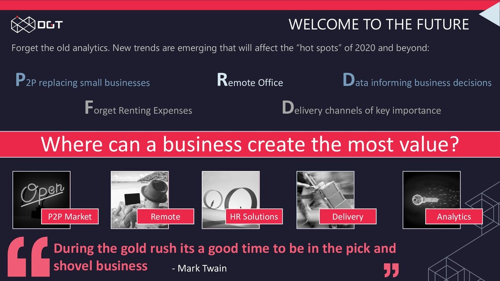 most value? During the gold rush its a good time to be in the pick and shovel business - Mark Twain Forget the old analytics. New trends are emerging that will affect the “hot spots” of 2020 and beyond: Remote Office Forget Renting Expenses P2P replacing small businesses Delivery channels of key importance Data informing business decisions P2P Market Remote HR Solutions Delivery Analytics