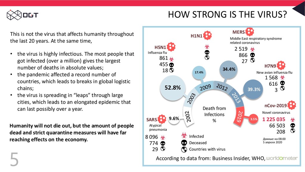 3.5% Death from Infections % nCov-2019 H7N9 MERS H1N1 H5N1 SARS Данные на 08:00 5 апреля 2020 1 225 035 66 503 208 Novel coronavirus 1 568 616 3 New avian influenza flu 2 519 866 27 Middle East respiratory syndrome related coronavirus 861 455 18 Influenza flu 8 096 774 29 Atypical pneumonia Infected Deceased Countries with virus According to data from: Business Insider, WHO, This is not the virus that affects humanity throughout the last 20 years. At the same time, • the virus is highly infectious. The most people that got infected (over a million) gives the largest number of deaths in absolute values; • the pandemic affected a record number of countries, which leads to breaks in global logistic chains; • the virus is spreading in “leaps” through large cities, which leads to an elongated epidemic that can last possibly over a year. Humanity will not die out, but the amount of people dead and strict quarantine measures will have far reaching effects on the economy.