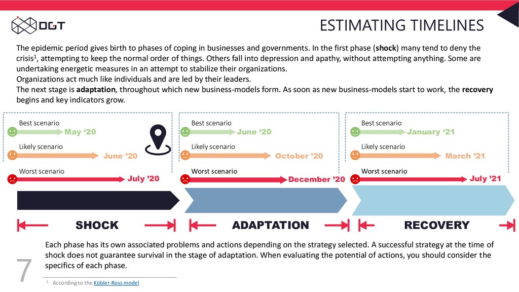 coping in businesses and governments. In the first phase (shock) many tend to deny the crisis1, attempting to keep the normal order of things. Others fall into depression and apathy, without attempting anything. Some are undertaking energetic measures in an attempt to stabilize their organizations. Organizations act much like individuals and are led by their leaders. The next stage is adaptation, throughout which new business-models form. As soon as new business-models start to work, the recovery begins and key indicators grow. SHOCK Best scenario Likely scenario Worst scenario May ‘20 June ’20 July ’20 1 According to the Kübler-Ross model Each phase has its own associated problems and actions depending on the strategy selected. A successful strategy at the time of shock does not guarantee survival in the stage of adaptation. When evaluating the potential of actions, you should consider the specifics of each phase. ADAPTATION Best scenario Likely scenario Worst scenario June ‘20 October ’20 December ’20 RECOVERY Best scenario Likely scenario Worst scenario January ‘21 March ’21 July ’21