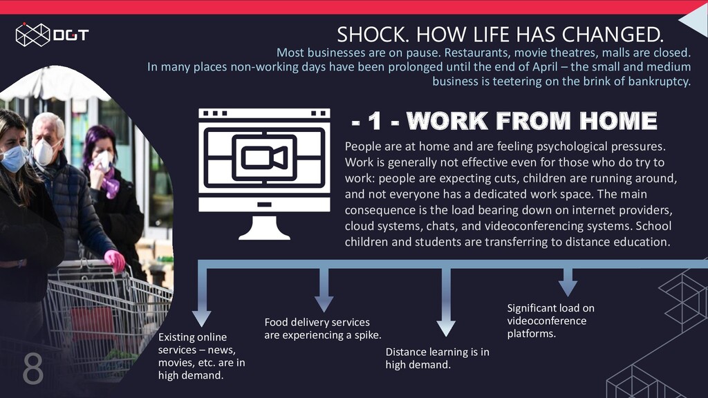 are feeling psychological pressures. Work is generally not effective even for those who do try to work: people are expecting cuts, children are running around, and not everyone has a dedicated work space. The main consequence is the load bearing down on internet providers, cloud systems, chats, and videoconferencing systems. School children and students are transferring to distance education. Most businesses are on pause. Restaurants, movie theatres, malls are closed. In many places non-working days have been prolonged until the end of April – the small and medium business is teetering on the brink of bankruptcy. Existing online services – news, movies, etc. are in high demand. Distance learning is in high demand. Food delivery services are experiencing a spike. Significant load on videoconference platforms. - 1 - WORK FROM HOME
