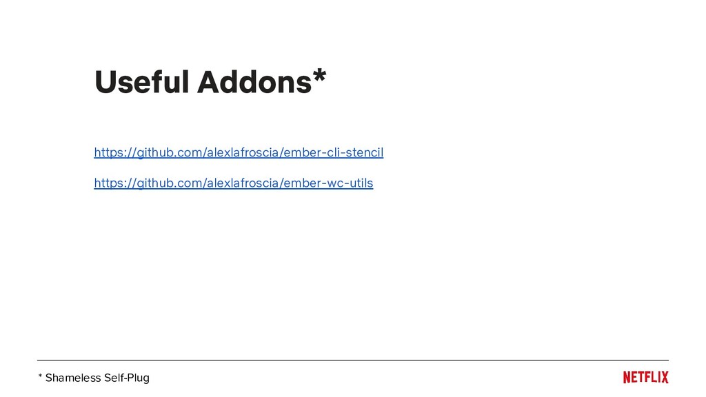 Useful Addons* * Shameless Self-Plug https://github.com/alexlafroscia/ember-cli-stencil https://github.com/alexlafroscia/ember-wc-utils