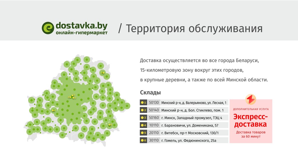 зону вокруг этих городов, в крупные деревни, а также по всей Минской области. 1 3 2 4 6 5 Склады 50130 50140 50160 10110 20110 30110 Минский р-н, д. Валерьяново, ул. Лесная, 1 Минский р-н, д. Бол. Стиклево, пом. 1 г. Минск, Западный промузел, ТЭЦ 4 г. Барановичи, ул. Доменикана, 57 г. Витебск, пр-т Московский, 130/1 г. Гомель, ул. Федюнинского, 25а 1 2 3 4 5 6 ДОПОЛНИТЕЛЬНАЯ УСЛУГА Доставка товаров за 60 минут Экспресс- доставка