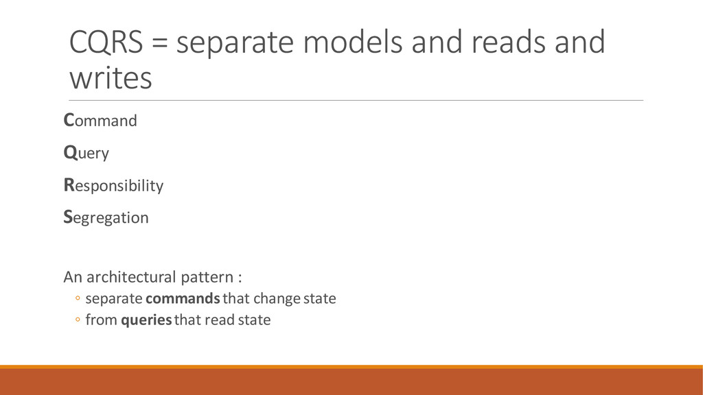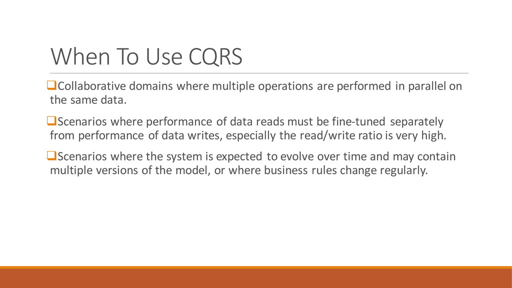 performed in parallel on the same data. Scenarios where performance of data reads must be fine-tuned separately from performance of data writes, especially the read/write ratio is very high. Scenarios where the system is expected to evolve over time and may contain multiple versions of the model, or where business rules change regularly.