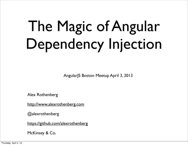 useful 3. How we use Dependency Injection in Angular 4. How Angular implements DI 5. Use our knowledge to break Angular 6. We’ll unbreak it Thursday, April 4, 13