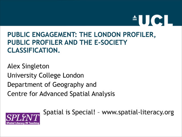 CLASSIFICATION. Alex Singleton University College London Department of Geography and Centre for Advanced Spatial Analysis ! Spatial is Special! – www.spatial-literacy.org