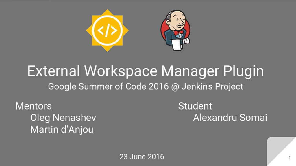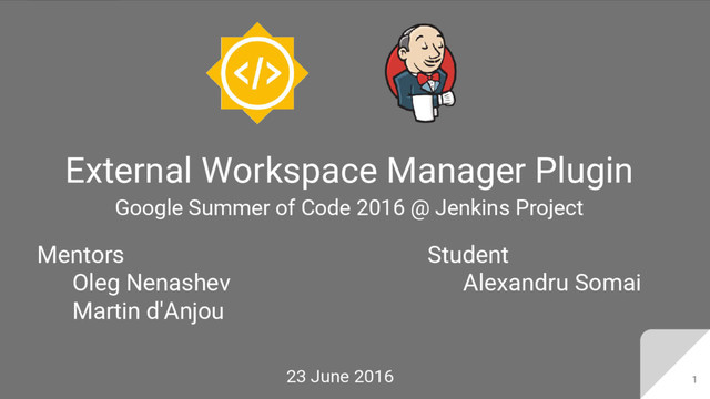 This is the presentation about External Workspace Manager Plugin for the Google Summer of Code 2016 midterm evaluation.