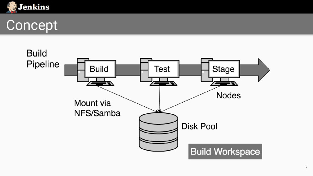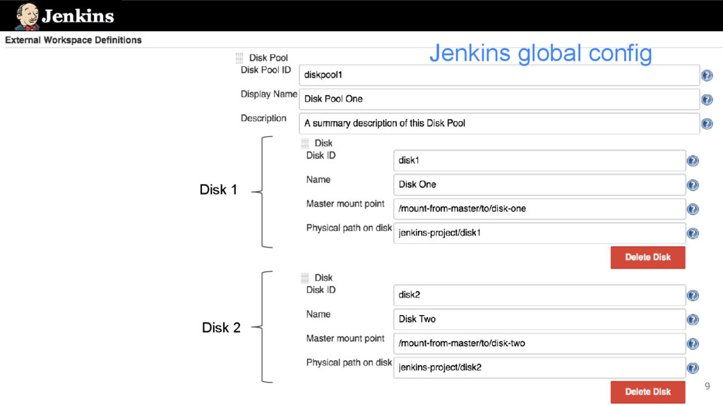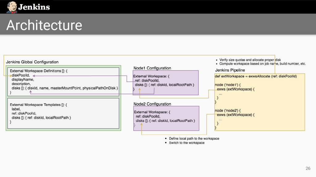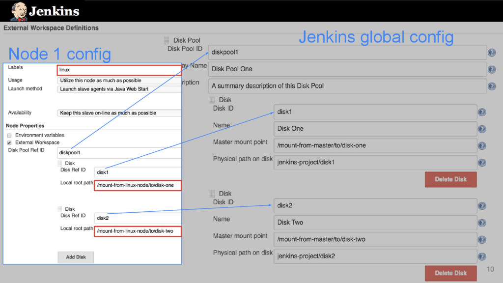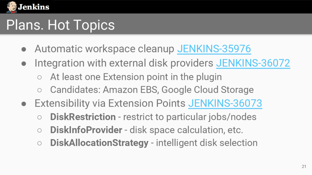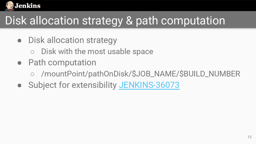 strategy ◦ Disk with the most usable space • Path computation ◦ /mountPoint/pathOnDisk/$JOB_NAME/$BUILD_NUMBER • Subject for extensibility JENKINS-36073