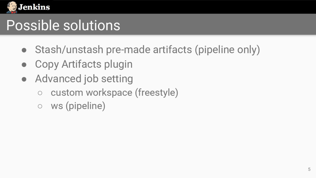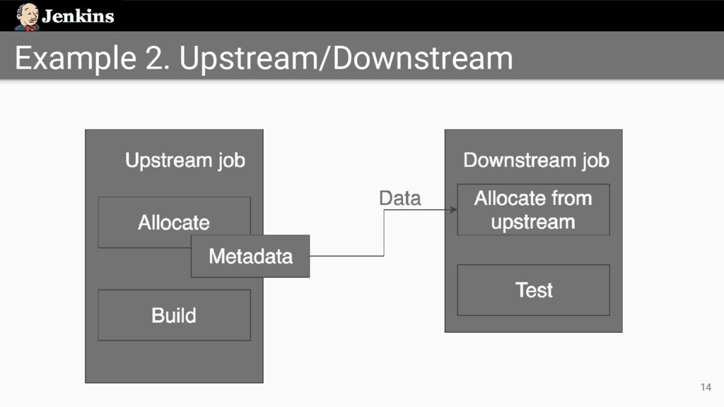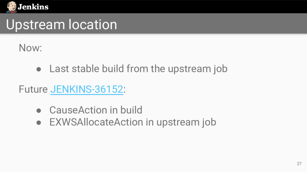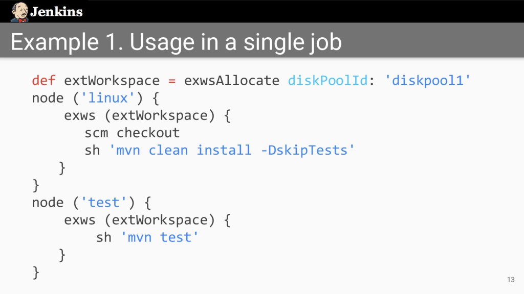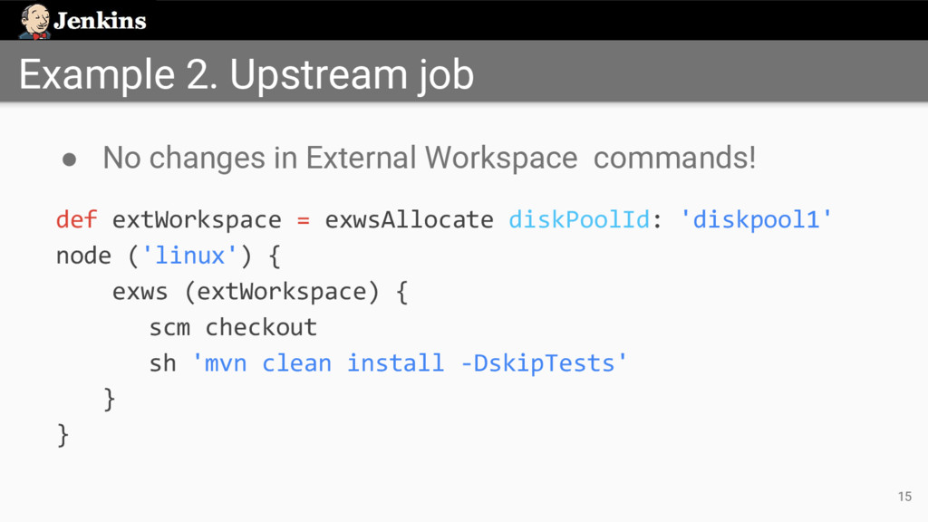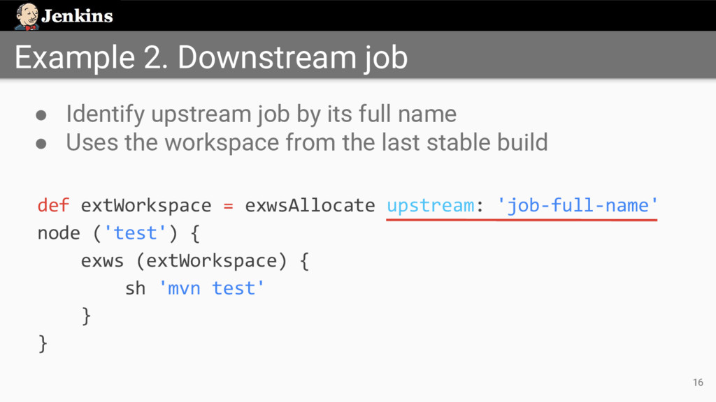 'job-full-name' node ('test') { exws (extWorkspace) { sh 'mvn test' } } • Identify upstream job by its full name • Uses the workspace from the last stable build