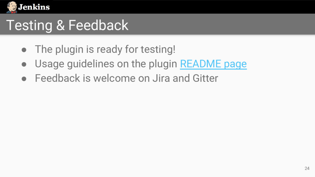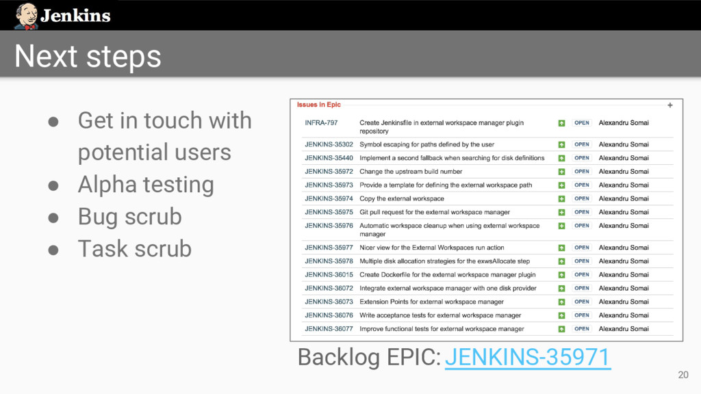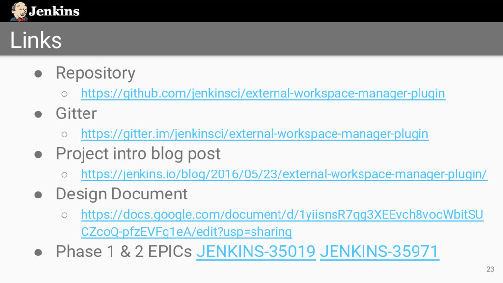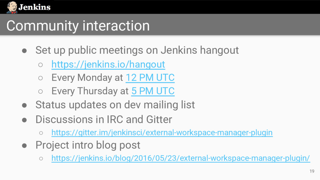 ◦ https://jenkins.io/hangout ◦ Every Monday at 12 PM UTC ◦ Every Thursday at 5 PM UTC • Status updates on dev mailing list • Discussions in IRC and Gitter ◦ https://gitter.im/jenkinsci/external-workspace-manager-plugin • Project intro blog post ◦ https://jenkins.io/blog/2016/05/23/external-workspace-manager-plugin/ 19