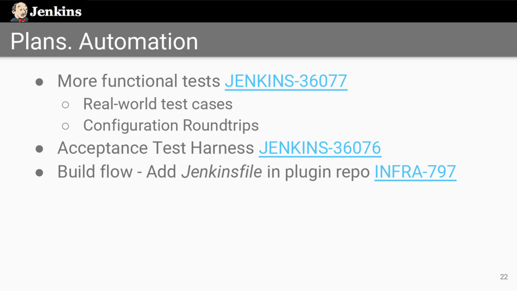 with external disk providers JENKINS-36072 ◦ At least one Extension point in the plugin ◦ Candidates: Amazon EBS, Google Cloud Storage • Extensibility via Extension Points JENKINS-36073 ◦ DiskRestriction - restrict to particular jobs/nodes ◦ DiskInfoProvider - disk space calculation, etc. ◦ DiskAllocationStrategy - intelligent disk selection 21