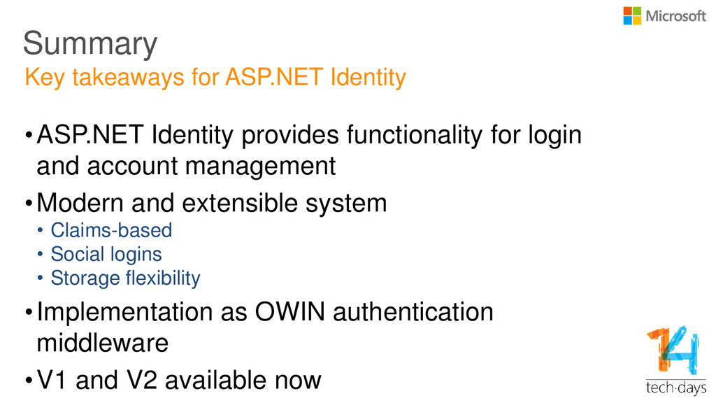 ASP.NET 4.5.1 heeft een complete vernieuwd security model. Het maakt gebruik van claims-based security en Entity Framework 6. In deze sessie leer je hoe je ASP.NET identity gebruikt om authenticatie en autorisatie in je web applicaties te implementeren.