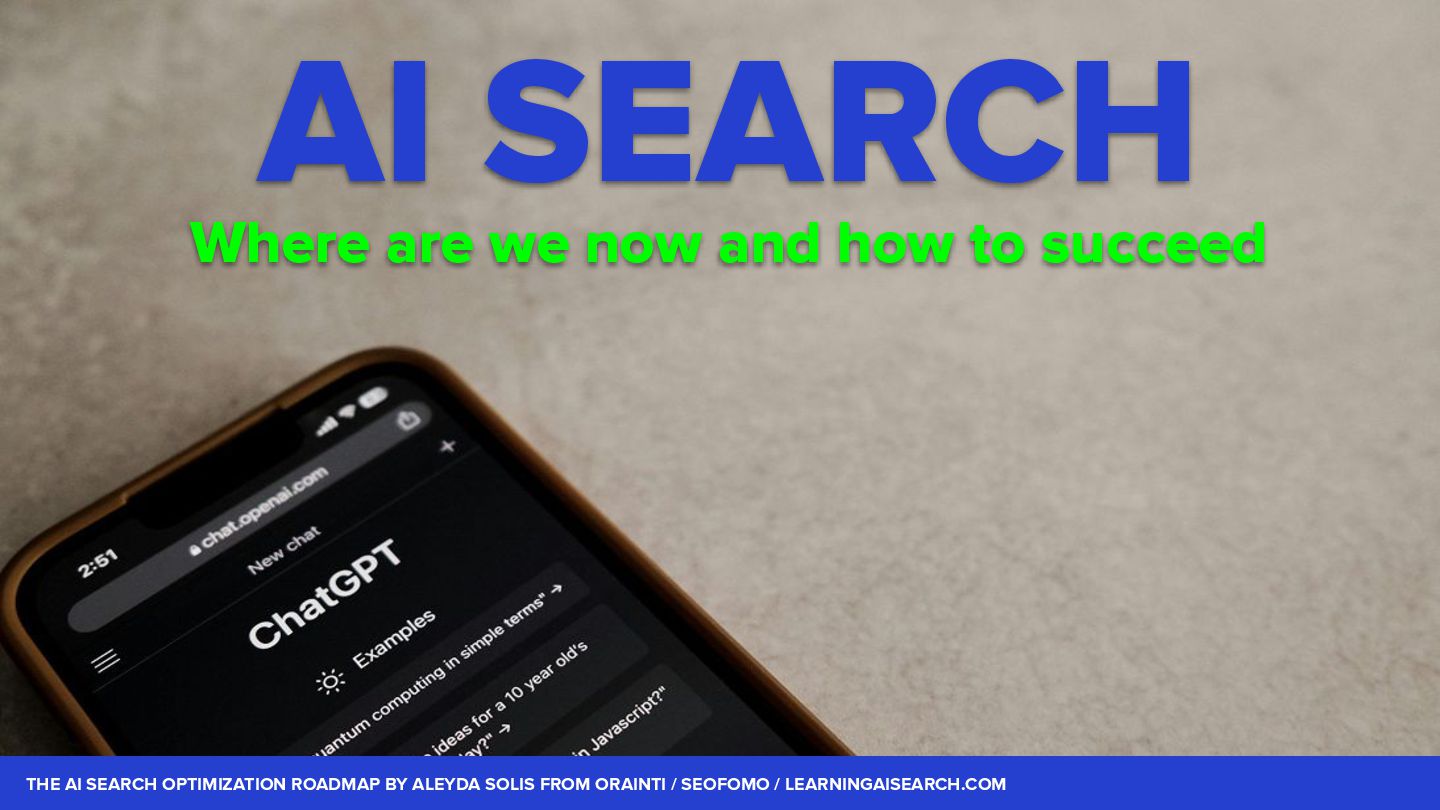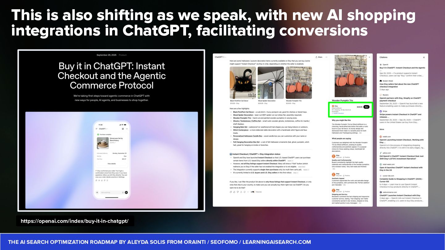 SEOFOMO / LEARNINGAISEARCH.COM THE AI SEARCH OPTIMIZATION ROADMAP BY ALEYDA SOLIS FROM ORAINTI / SEOFOMO / LEARNINGAISEARCH.COM This is also shifting as we speak, with new AI shopping integrations in ChatGPT, facilitating conversions https://openai.com/index/buy-it-in-chatgpt/