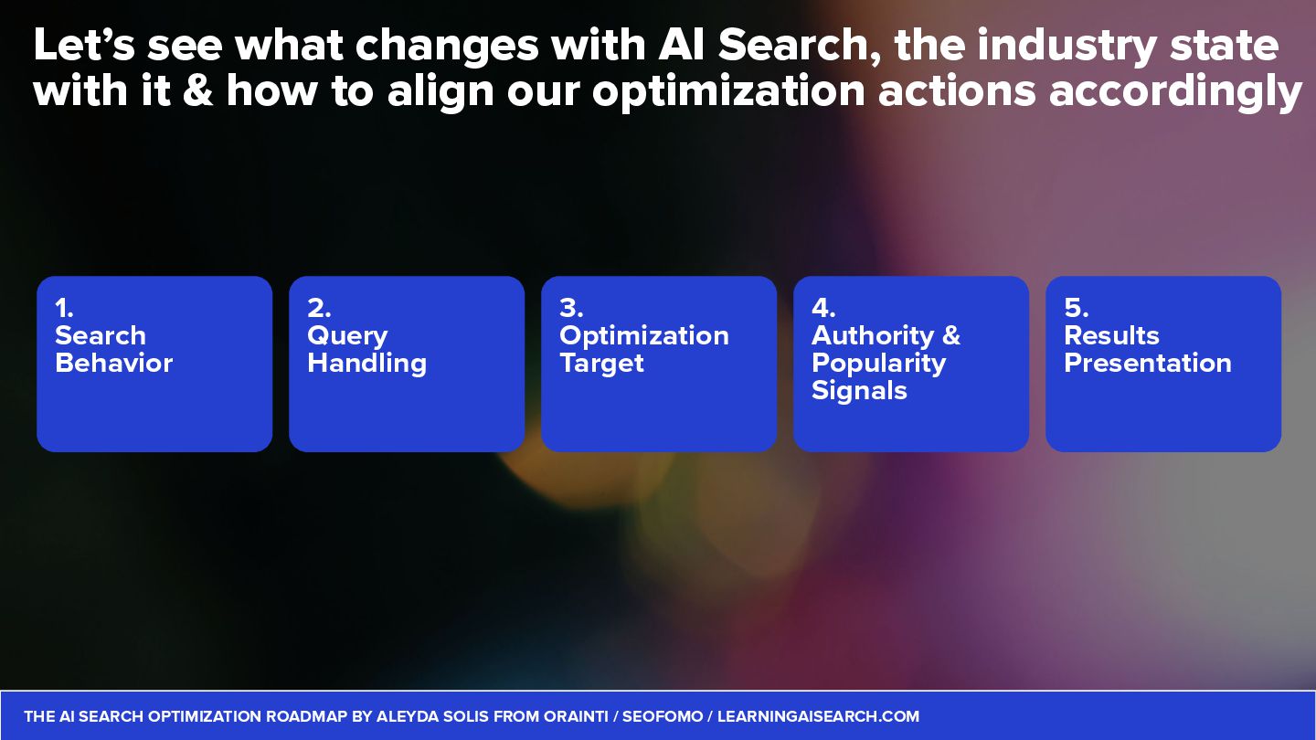 Authority & Popularity Signals 5. Results Presentation THE AI SEARCH OPTIMIZATION ROADMAP BY ALEYDA SOLIS FROM ORAINTI / SEOFOMO / LEARNINGAISEARCH.COM Let’s see what changes with AI Search, the industry state with it & how to align our optimization actions accordingly