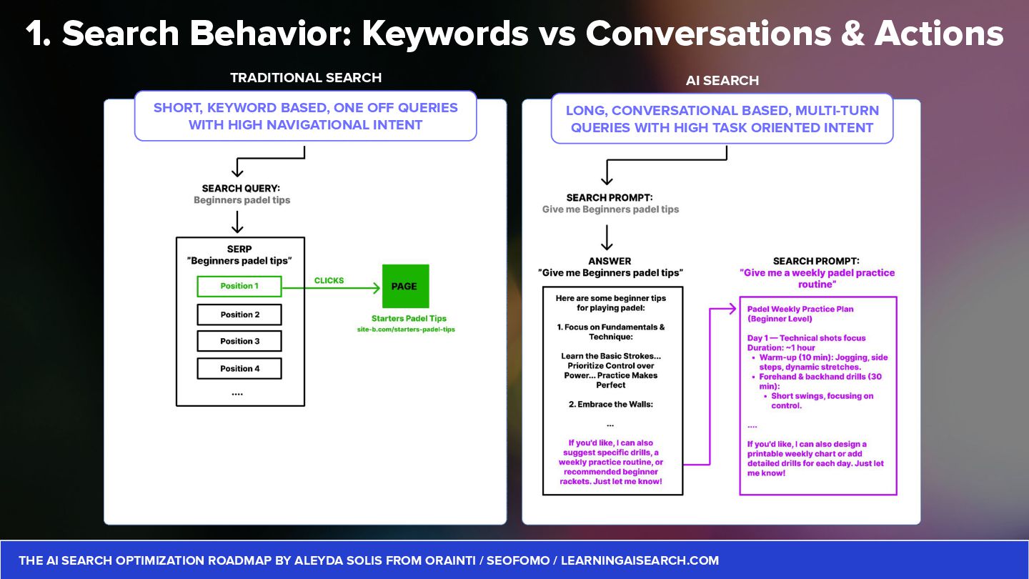 BASED, ONE OFF QUERIES WITH HIGH NAVIGATIONAL INTENT TRADITIONAL SEARCH LONG, CONVERSATIONAL BASED, MULTI-TURN QUERIES WITH HIGH TASK ORIENTED INTENT AI SEARCH THE AI SEARCH OPTIMIZATION ROADMAP BY ALEYDA SOLIS FROM ORAINTI / SEOFOMO / LEARNINGAISEARCH.COM